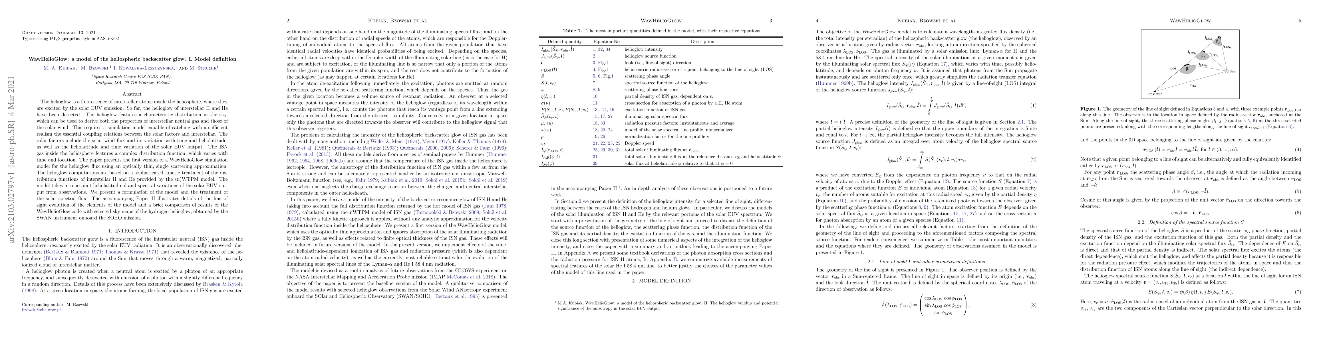 The helioglow is a fluorescence of interstellar atoms inside the heliosphere, where they are excited by the solar EUV emission. So far, the helioglow of interstellar H and He have been detected. The helioglow features a characteristic distribution in the sky, which can be used to derive both the properties of interstellar neutral gas and those of the solar wind. This requires a simulation model capable of catching with a sufficient realism the essential coupling relations between the solar factors and interstellar. The solar factors include the solar wind flux and its variation with time and heliolatitude, as well as the heliolatitude and time variation of the solar EUV output. The ISN gas inside the heliosphere features a complex distribution function, which varies with time and location. The paper presents the first version of a WawHelioGlow simulation model for the helioglow flux using an optically thin, single scattering approximation. The helioglow computations are based on a sophisticated kinetic treatment of the distribution functions of interstellar H and He provided by the (n)WTPM model. The model takes into account heliolatitudinal and spectral variations of the solar EUV output from observations. We present a formulation of the model and the treatment of the solar spectral flux. The accompanying Paper II illustrates details of the line of sight evolution of the elements of the model and a brief comparison of results of the WawHelioGlow code with selected sky maps of the hydrogen helioglow, obtained by the SWAN instrument onboard the SOHO mission.