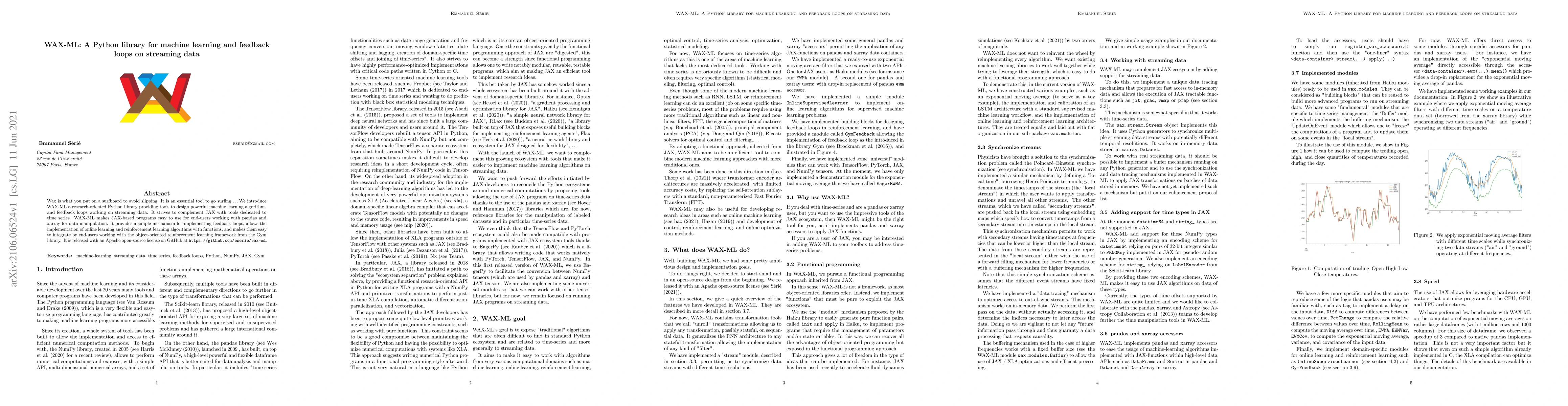 WAX-ML is a Python library designed to facilitate machine learning and feedback loops on streaming data, complementing JAX with tools for time series. It integrates seamlessly with pandas and xarray for data manipulation and supports online learning and reinforcement learning algorithms.