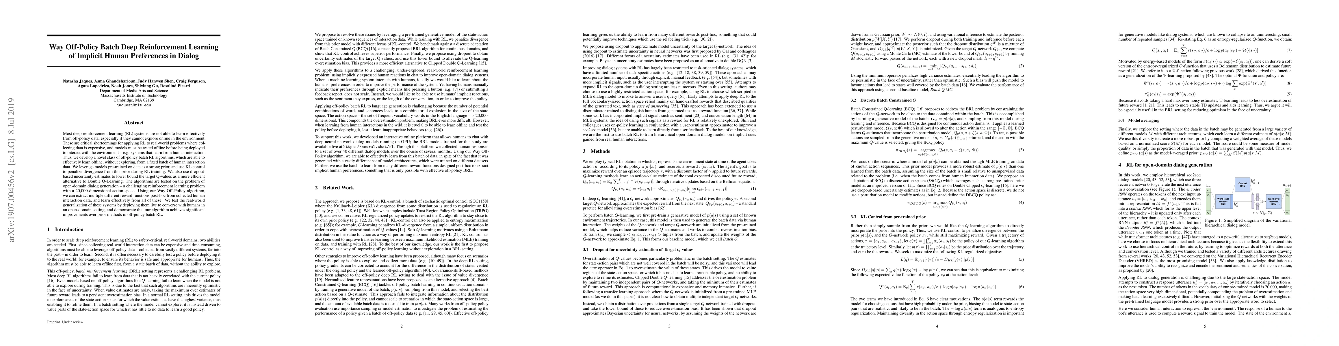 This paper introduces a novel off-policy batch deep reinforcement learning approach for learning implicit human preferences in dialog systems. The proposed Way Off-Policy algorithm leverages pre-trained models and KL-control to effectively learn from offline data without exploration, achieving significant improvements over prior methods in real-world generalization tests.