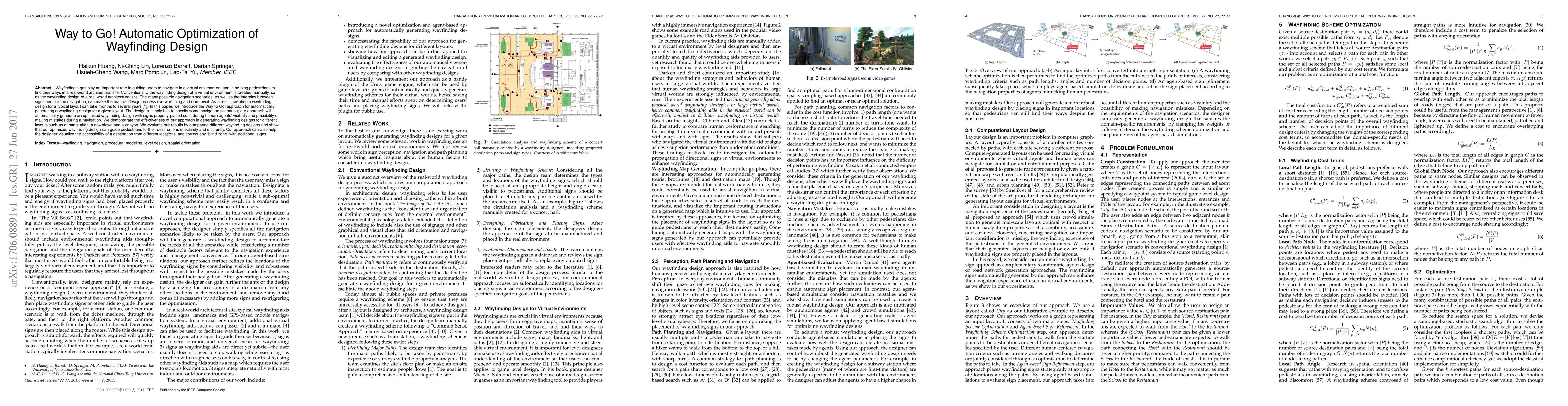 Wayfinding signs play an important role in guiding users to navigate in a virtual environment and in helping pedestrians to find their ways in a real-world architectural site. Conventionally, the wayfinding design of a virtual environment is created manually, so as the wayfinding design of a real-world architectural site. The many possible navigation scenarios, as well as the interplay between signs and human navigation, can make the manual design process overwhelming and non-trivial. As a result, creating a wayfinding design for a typical layout can take months to several years. In this paper, we introduce the Way to Go! approach for automatically generating a wayfinding design for a given layout. The designer simply has to specify some navigation scenarios; our approach will automatically generate an optimized wayfinding design with signs properly placed considering human agents' visibility and possibility of making mistakes during a navigation. We demonstrate the effectiveness of our approach in generating wayfinding designs for different layouts such as a train station, a downtown and a canyon. We evaluate our results by comparing different wayfinding designs and show that our optimized wayfinding design can guide pedestrians to their destinations effectively and efficiently. Our approach can also help the designer visualize the accessibility of a destination from different locations, and correct any "blind zone" with additional signs.
