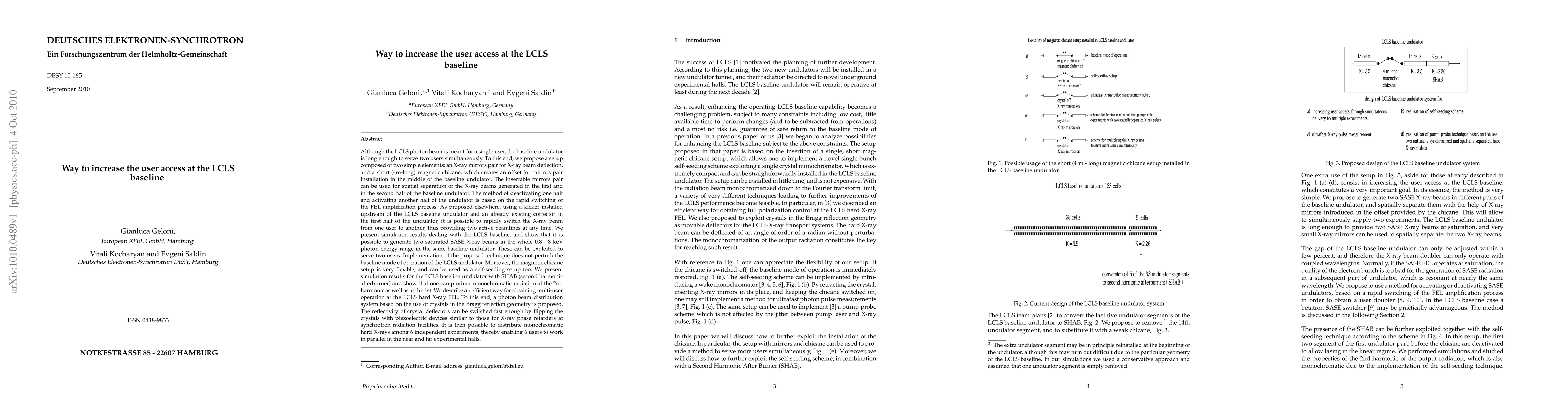 The LCLS beam is meant for a single user, but the baseline undulator is long enough to serve two users simultaneously. To this end, we propose a setup composed of two elements: an X-ray mirrors pair for X-ray beam deflection, and a 4 m-long magnetic chicane, which creates an offset for mirrors pair installation in the middle of the baseline undulator. The insertable mirrors pair can separate spatially the X-ray beams generated in the first and in the second half of the baseline undulator. Rapid switching of the FEL amplification process allows deactivating one half and activating another half of the undulator. As proposed elsewhere, using a kicker installed upstream of the LCLS baseline undulator and an already existing corrector in the first half of the undulator, it is possible to rapidly switch the X-ray beam from one user to another. We present simulation results for the LCLS baseline, and show that it is possible to generate two saturated SASE X-ray beams in the whole 0.8-8 keV photon energy range in the same baseline undulator. These can serve two users. Our technique does not perturb the baseline mode of operation of the LCLS undulator. Also, the magnetic chicane setup is very flexible, and can be used as a self-seeding setup too. We present simulation results for the LCLS baseline undulator with SHAB. One can produce monochromatic radiation at the 2nd harmonic as well as at the 1st. We describe an efficient way for obtaining multi-user operation at the LCLS hard X-ray FEL. To this end, a photon beam distribution system based on the use of crystals in the Bragg reflection geometry is proposed. The reflectivity of crystal deflectors can be switched fast enough by flipping the crystals with piezoelectric devices. Monochromatic hard X-rays can then be distributed among 6 independent experiments, thereby enabling 6 users to work in parallel in the near and far experimental halls.