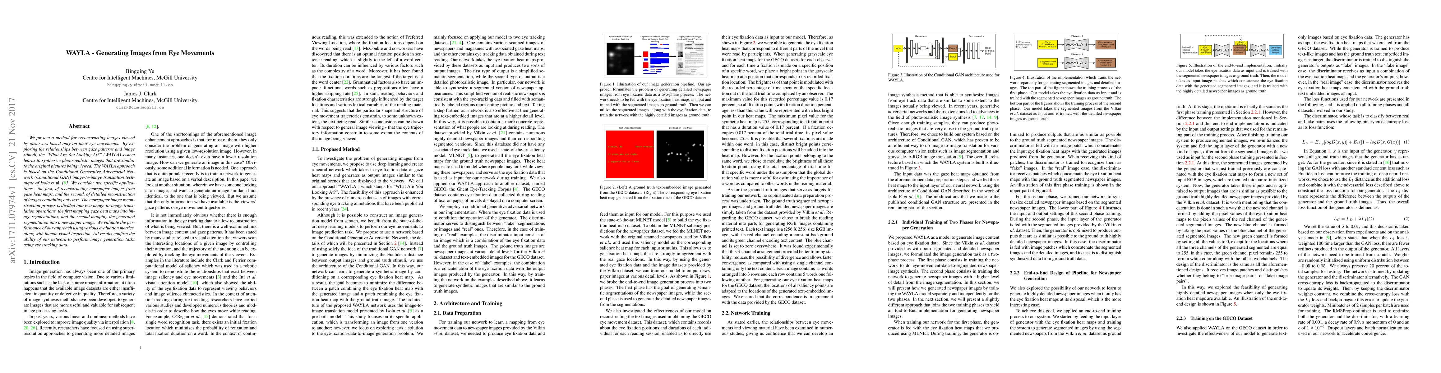 We present a method for reconstructing images viewed by observers based only on their eye movements. By exploring the relationships between gaze patterns and image stimuli, the "What Are You Looking At?" (WAYLA) system learns to synthesize photo-realistic images that are similar to the original pictures being viewed. The WAYLA approach is based on the Conditional Generative Adversarial Network (Conditional GAN) image-to-image translation technique of Isola et al. We consider two specific applications - the first, of reconstructing newspaper images from gaze heat maps, and the second, of detailed reconstruction of images containing only text. The newspaper image reconstruction process is divided into two image-to-image translation operations, the first mapping gaze heat maps into image segmentations, and the second mapping the generated segmentation into a newspaper image. We validate the performance of our approach using various evaluation metrics, along with human visual inspection. All results confirm the ability of our network to perform image generation tasks using eye tracking data.