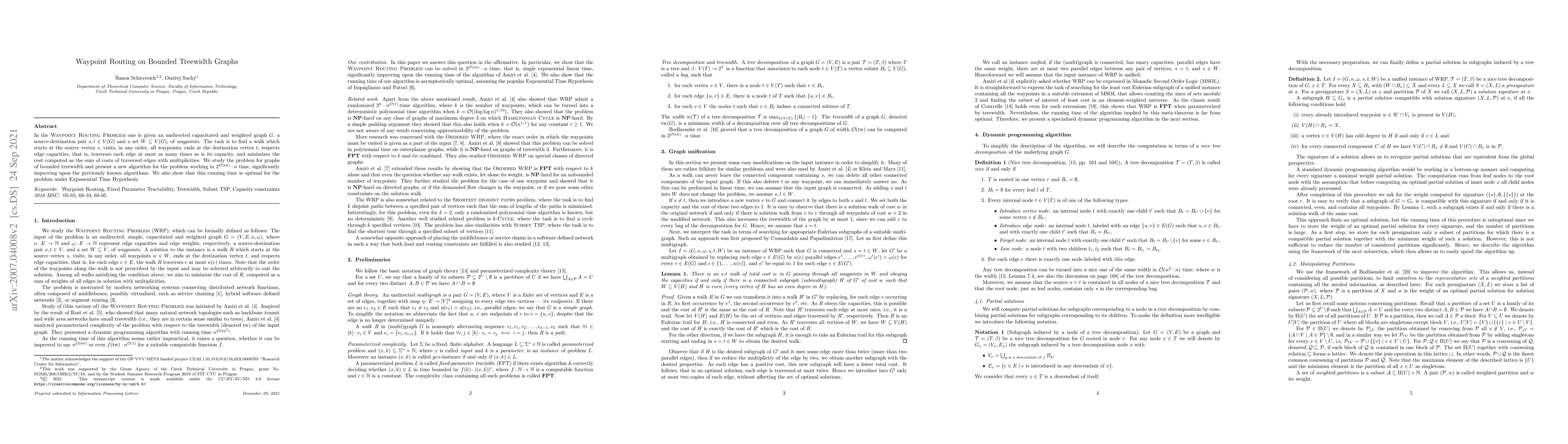 This paper presents a new algorithm for solving the Waypoint Routing Problem on graphs with bounded treewidth, achieving a runtime of $2^{O(\mathrm{tw})}\cdot n$ and demonstrating its optimality under the Exponential Time Hypothesis. Previous algorithms are significantly outperformed.