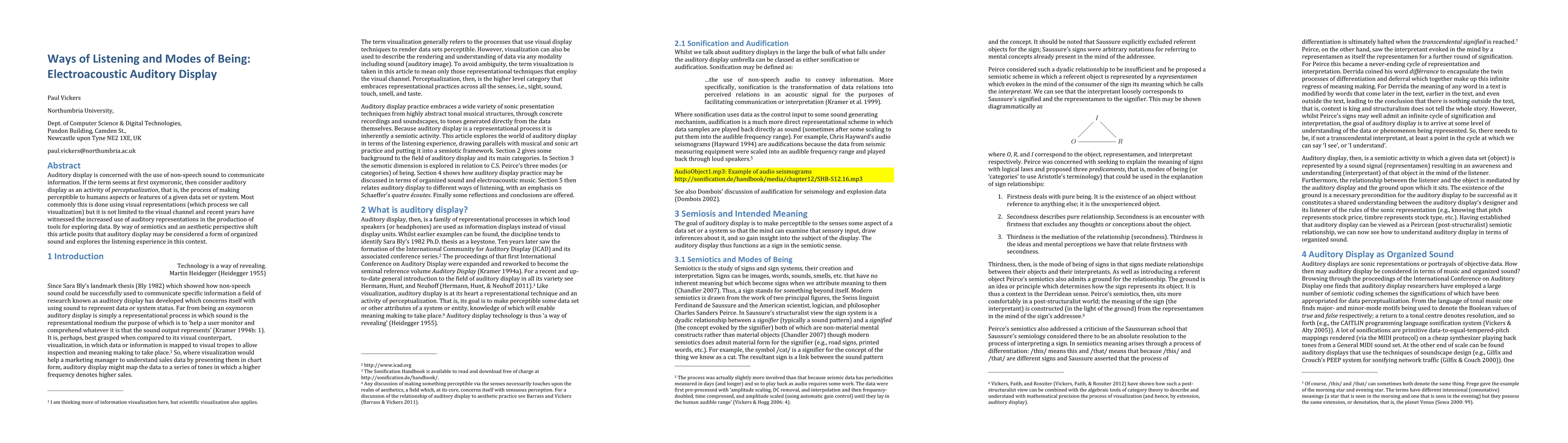 Auditory display is concerned with the use of non-speech sound to communicate information. If the term seems at first oxymoronic, then consider auditory display as an activity of perceptualization, that is, the process of making perceptible to humans aspects or features of a given data set or system. Most commonly this is done using visual representations (which process we call visualization) but it is not limited to the visual channel and recent years have witnessed the increased use of auditory representations in the production of tools for exploring data. By way of semiotics and an aesthetic perspective shift this article posits that auditory display may be considered a form of organized sound and explores the listening experience in this context.