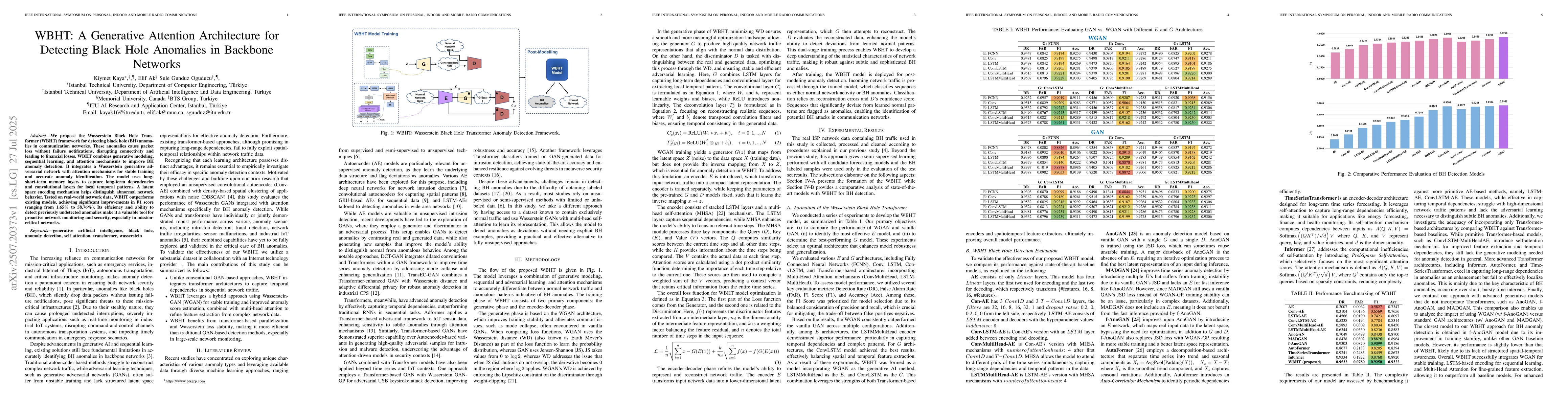 We propose the Wasserstein Black Hole Transformer (WBHT) framework for detecting black hole (BH) anomalies in communication networks. These anomalies cause packet loss without failure notifications, disrupting connectivity and leading to financial losses. WBHT combines generative modeling, sequential learning, and attention mechanisms to improve BH anomaly detection. It integrates a Wasserstein generative adversarial network with attention mechanisms for stable training and accurate anomaly identification. The model uses long-short-term memory layers to capture long-term dependencies and convolutional layers for local temporal patterns. A latent space encoding mechanism helps distinguish abnormal network behavior. Tested on real-world network data, WBHT outperforms existing models, achieving significant improvements in F1 score (ranging from 1.65% to 58.76%). Its efficiency and ability to detect previously undetected anomalies make it a valuable tool for proactive network monitoring and security, especially in mission-critical networks.