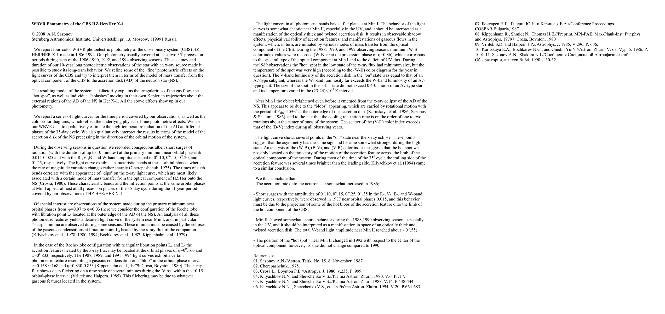 The research utilized 10-year long four-color WBVR photoelectric photometry of the close binary system HZ HER/HER X-1, covering at least two 35d precession periods during each observing season from 1986 to 1994.