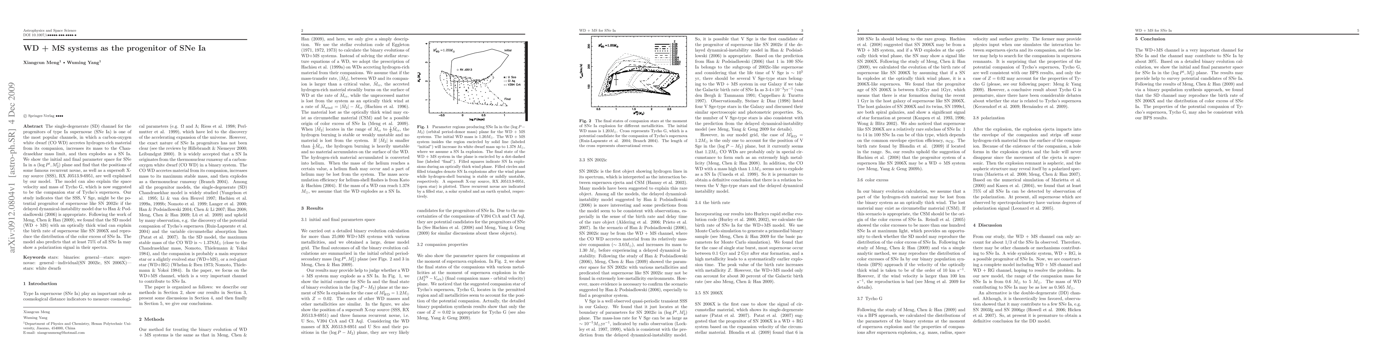 We show the initial and final parameter space for SNe Ia in a ($\log P^{\rm i}, M_{\rm 2}^{\rm i}$) plane and find that the positions of some famous recurrent novae, as well as a supersoft X-ray source (SSS), RX J0513.9-6951, are well explained by our model. The model can also explain the space velocity and mass of Tycho G, which is now suggested to be the companion star of Tycho's supernova. Our study indicates that the SSS, V Sge, might be the potential progenitor of supernovae like SN 2002ic if the delayed dynamical-instability model due to Han & Podsiadlowski (2006) is appropriate. Following the work of Meng, Chen & Han (2009), we found that the SD model (WD + MS) with an optically thick wind can explain the birth rate of supernovae like SN 2006X and reproduce the distribution of the color excess of SNe Ia. The model also predicts that at least 75% of all SNe Ia may show a polarization signal in their spectra.
