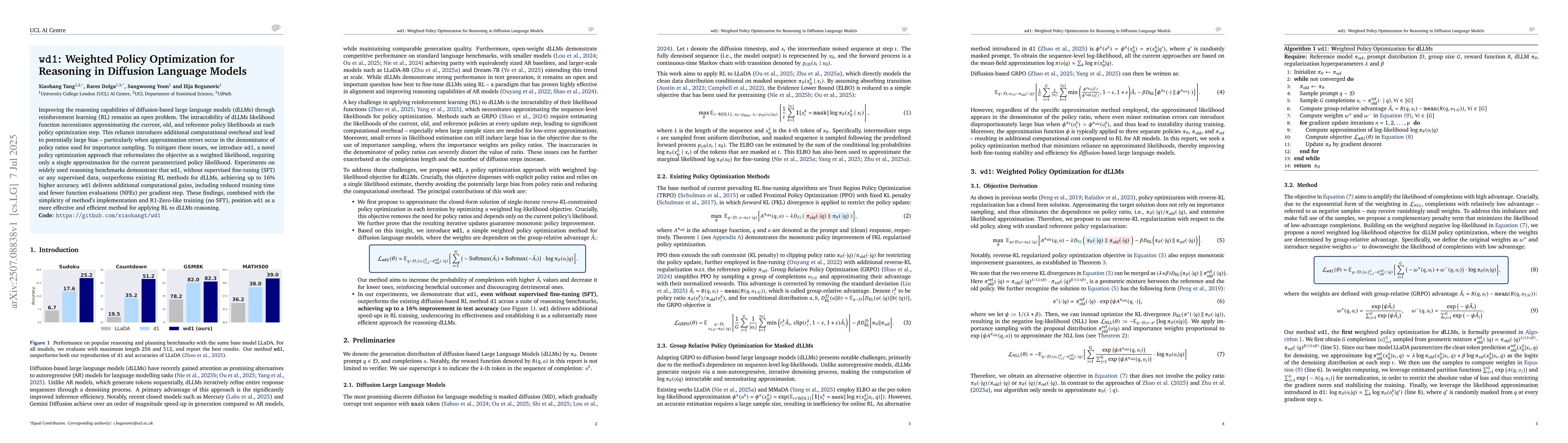 Improving the reasoning capabilities of diffusion-based large language models (dLLMs) through reinforcement learning (RL) remains an open problem. The intractability of dLLMs likelihood function necessitates approximating the current, old, and reference policy likelihoods at each policy optimization step. This reliance introduces additional computational overhead and lead to potentially large bias -- particularly when approximation errors occur in the denominator of policy ratios used for importance sampling. To mitigate these issues, we introduce $\mathtt{wd1}$, a novel policy optimization approach that reformulates the objective as a weighted likelihood, requiring only a single approximation for the current parametrized policy likelihood. Experiments on widely used reasoning benchmarks demonstrate that $\mathtt{wd1}$, without supervised fine-tuning (SFT) or any supervised data, outperforms existing RL methods for dLLMs, achieving up to 16% higher accuracy. $\mathtt{wd1}$ delivers additional computational gains, including reduced training time and fewer function evaluations (NFEs) per gradient step. These findings, combined with the simplicity of method's implementation and R1-Zero-like training (no SFT), position $\mathtt{wd1}$ as a more effective and efficient method for applying RL to dLLMs reasoning.