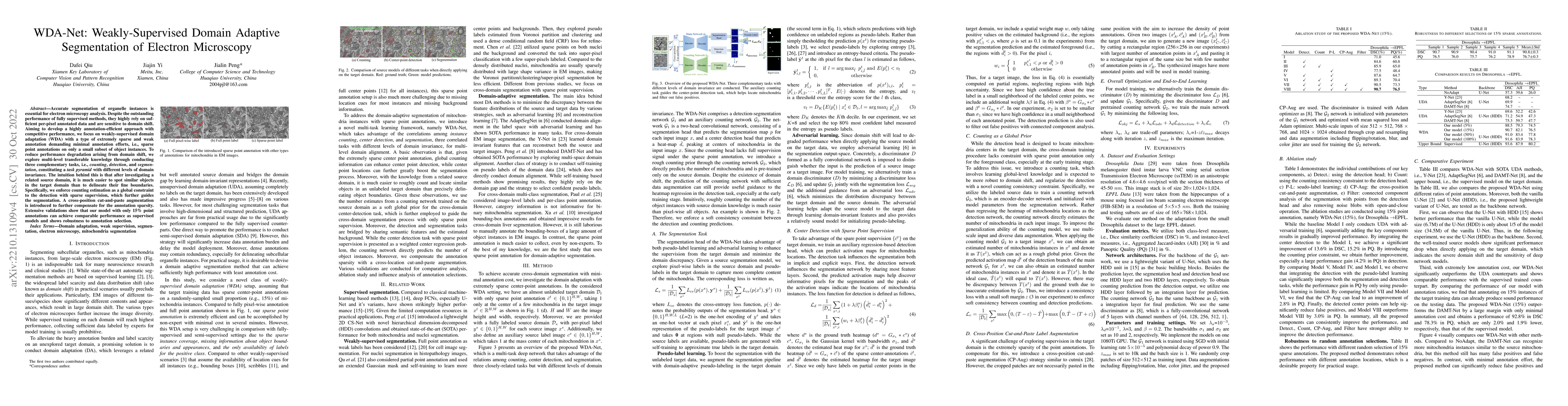 WDA-Net presents a weakly-supervised domain adaptive segmentation method for electron microscopy, utilizing sparse point annotations to achieve competitive performance. It employs multi-level transferable knowledge through counting, detection, and segmentation tasks to mitigate domain shift and compensate for annotation sparsity.