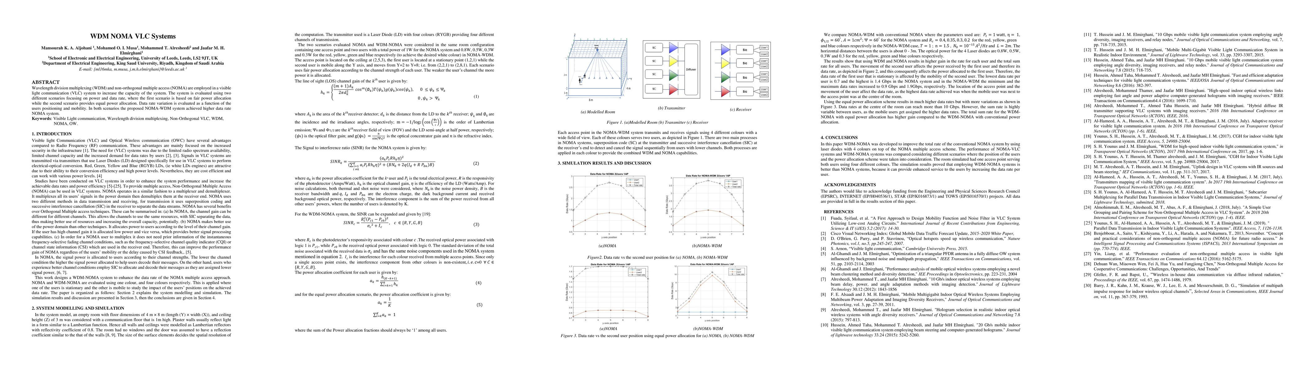 Wavelength division multiplexing (WDM) and non-orthogonal multiple access (NOMA) are employed in a visible light communication (VLC) system to increase the capacity of the system. The system is evaluated using two different scenarios focusing on power and data rate, where the first scenario is based on fair power allocation while the second scenario provides equal power allocation. Data rate variation is evaluated as a function of the users positioning and mobility. In both scenarios the proposed NOMA-WDM system achieved higher data rate NOMA system.