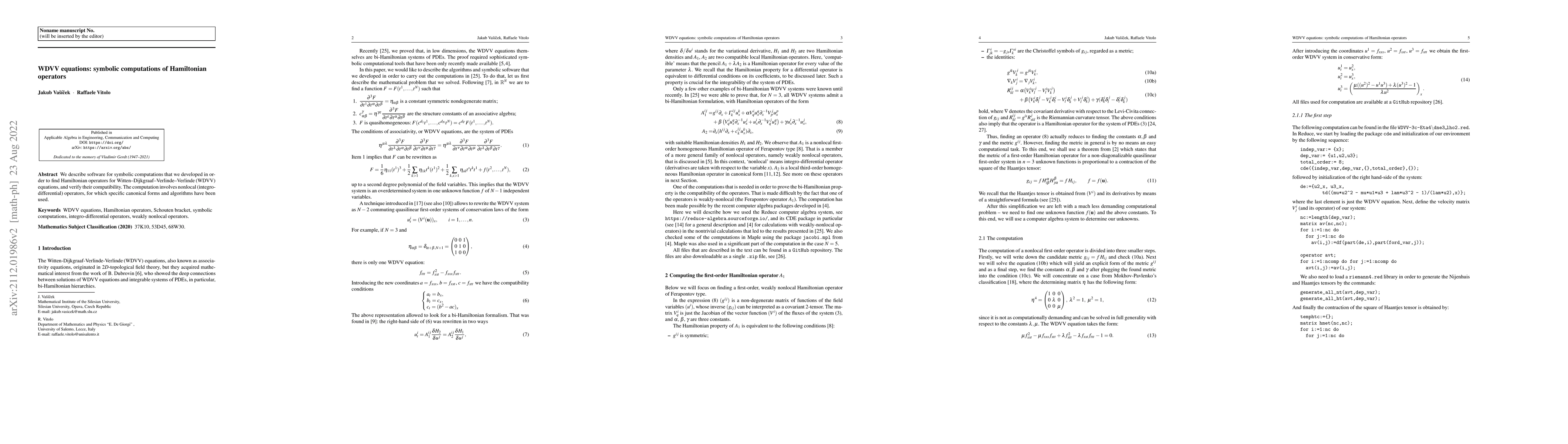 We describe software for symbolic computations that we developed in order to find Hamiltonian operators for Witten--Dijkgraaf--Verlinde--Verlinde (WDVV) equations, and verify their compatibility. The computation involves nonlocal (integro-differential) operators, for which specific canonical forms and algorithms have been used.