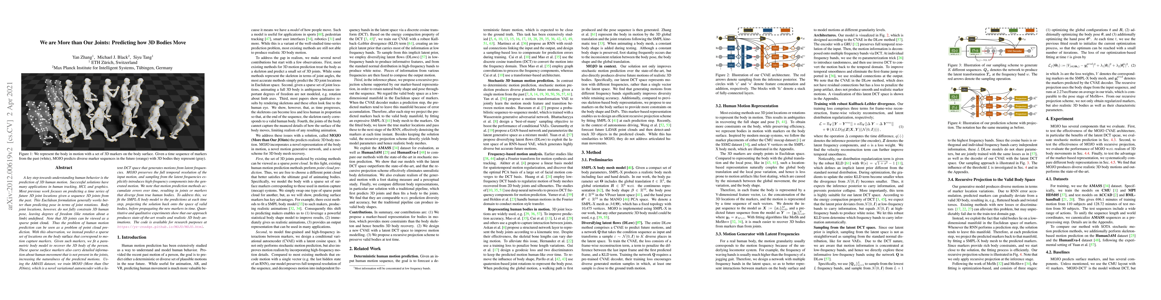 A key step towards understanding human behavior is the prediction of 3D human motion. Successful solutions have many applications in human tracking, HCI, and graphics. Most previous work focuses on predicting a time series of future 3D joint locations given a sequence 3D joints from the past. This Euclidean formulation generally works better than predicting pose in terms of joint rotations. Body joint locations, however, do not fully constrain 3D human pose, leaving degrees of freedom undefined, making it hard to animate a realistic human from only the joints. Note that the 3D joints can be viewed as a sparse point cloud. Thus the problem of human motion prediction can be seen as point cloud prediction. With this observation, we instead predict a sparse set of locations on the body surface that correspond to motion capture markers. Given such markers, we fit a parametric body model to recover the 3D shape and pose of the person. These sparse surface markers also carry detailed information about human movement that is not present in the joints, increasing the naturalness of the predicted motions. Using the AMASS dataset, we train MOJO, which is a novel variational autoencoder that generates motions from latent frequencies. MOJO preserves the full temporal resolution of the input motion, and sampling from the latent frequencies explicitly introduces high-frequency components into the generated motion. We note that motion prediction methods accumulate errors over time, resulting in joints or markers that diverge from true human bodies. To address this, we fit SMPL-X to the predictions at each time step, projecting the solution back onto the space of valid bodies. These valid markers are then propagated in time. Experiments show that our method produces state-of-the-art results and realistic 3D body animations. The code for research purposes is at https://yz-cnsdqz.github.io/MOJO/MOJO.html