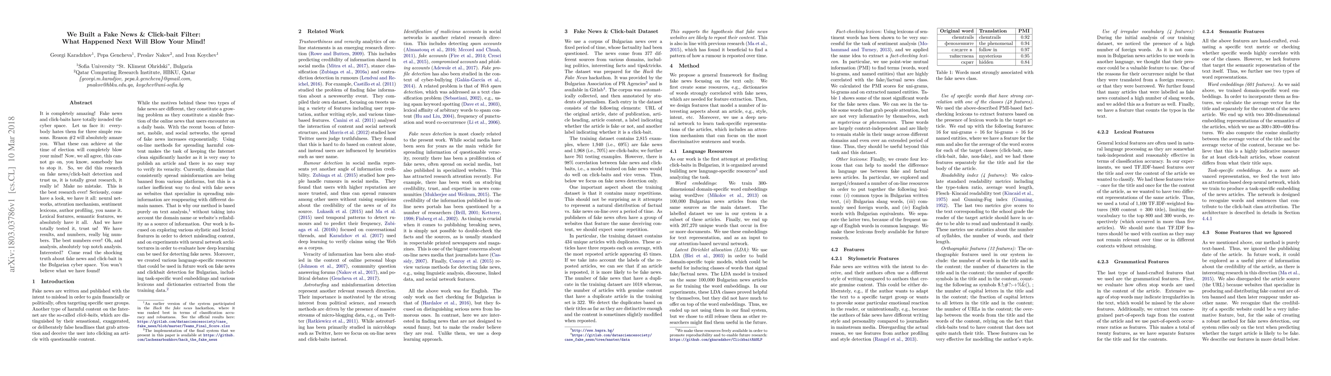 It is completely amazing! Fake news and click-baits have totally invaded the cyber space. Let us face it: everybody hates them for three simple reasons. Reason #2 will absolutely amaze you. What these can achieve at the time of election will completely blow your mind! Now, we all agree, this cannot go on, you know, somebody has to stop it. So, we did this research on fake news/click-bait detection and trust us, it is totally great research, it really is! Make no mistake. This is the best research ever! Seriously, come have a look, we have it all: neural networks, attention mechanism, sentiment lexicons, author profiling, you name it. Lexical features, semantic features, we absolutely have it all. And we have totally tested it, trust us! We have results, and numbers, really big numbers. The best numbers ever! Oh, and analysis, absolutely top notch analysis. Interested? Come read the shocking truth about fake news and click-bait in the Bulgarian cyber space. You won't believe what we have found!