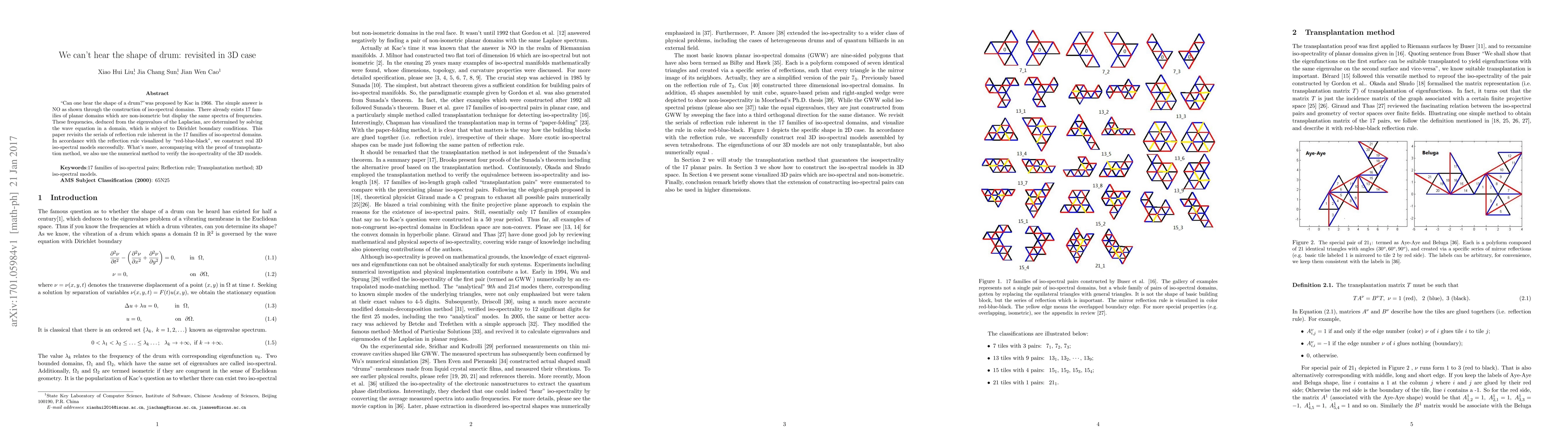 Can one hear the shape of a drum? was proposed by Kac in 1966. The simple answer is NO as shown through the construction of iso-spectral domains. There already exists 17 families of planar domains which are non-isometric but display the same spectra of frequencies. These frequencies, deduced from the eigenvalues of the Laplacian, are determined by solving the wave equation in a domain, which is subject to Dirichlet boundary conditions. This paper revisits the serials of reflection rule inherent in the 17 families of iso-spectral domains. In accordance with the reflection rule visualized by red-blue-black, we construct real 3D isospectral models successfully. What is more, accompanying with the proof of transplantation method, we also use the numerical method to verify the isospectrality of the 3D models.