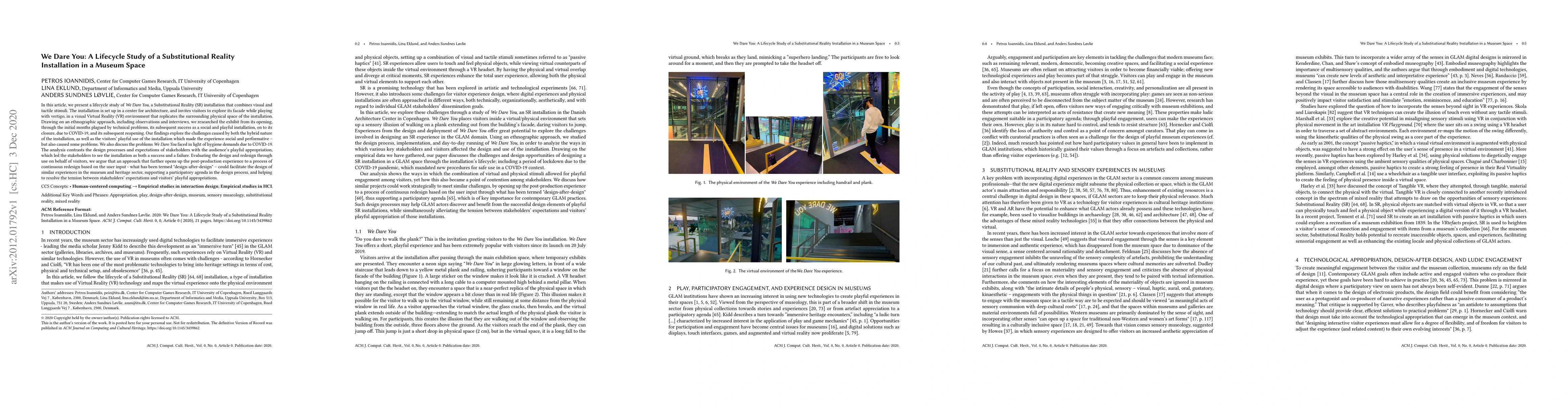 In this article, we present a lifecycle study of We Dare You, a Substitutional Reality (SR) installation that combines visual and tactile stimuli. The installation is set up in a center for architecture, and invites visitors to explore its facade while playing with vertigo, in a visual Virtual Reality (VR) environment that replicates the surrounding physical space of the installation. Drawing on an ethnographic approach, including observations and interviews, we researched the exhibit from its opening, through the initial months plagued by technical problems, its subsequent success as a social and playful installation, on to its closure, due to COVID-19, and its subsequent reopening. Our findings explore the challenges caused by both the hybrid nature of the installation, as well as the visitor' playful use of the installation which made the experience social and performative - but also caused some problems. We also discuss the problems We Dare You faced in light of hygiene demands due to COVID-19. The analysis contrasts the design processes and expectations of stakeholders with the audience's playful appropriation, which led the stakeholders to see the installation as both a success and a failure. Evaluating the design and redesign through use on behalf of visitors, we argue that an approach that further opens up the post-production experience to a process of continuous redesign based on the user input - what has been termed "design-after-design" - could facilitate the design of similar experiences in the museum and heritage sector, supporting a participatory agenda in the design process, and helping to resolve the tension between stakeholders' expectations and visitors' playful appropriations.