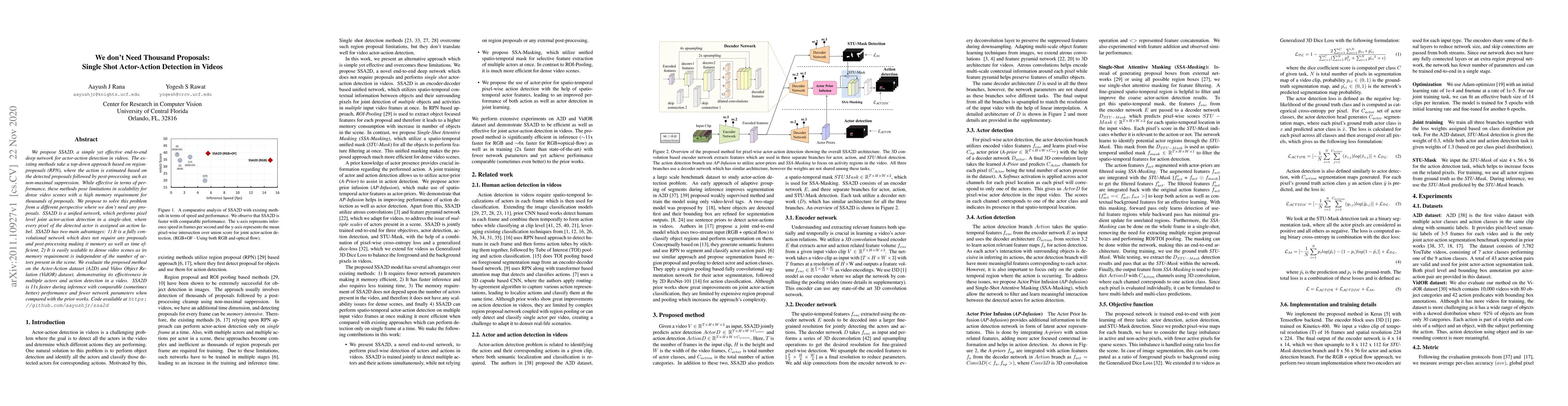 We propose SSA2D, a simple yet effective end-to-end deep network for actor-action detection in videos. The existing methods take a top-down approach based on region-proposals (RPN), where the action is estimated based on the detected proposals followed by post-processing such as non-maximal suppression. While effective in terms of performance, these methods pose limitations in scalability for dense video scenes with a high memory requirement for thousands of proposals. We propose to solve this problem from a different perspective where we don't need any proposals. SSA2D is a unified network, which performs pixel level joint actor-action detection in a single-shot, where every pixel of the detected actor is assigned an action label. SSA2D has two main advantages: 1) It is a fully convolutional network which does not require any proposals and post-processing making it memory as well as time efficient, 2) It is easily scalable to dense video scenes as its memory requirement is independent of the number of actors present in the scene. We evaluate the proposed method on the Actor-Action dataset (A2D) and Video Object Relation (VidOR) dataset, demonstrating its effectiveness in multiple actors and action detection in a video. SSA2D is 11x faster during inference with comparable (sometimes better) performance and fewer network parameters when compared with the prior works.