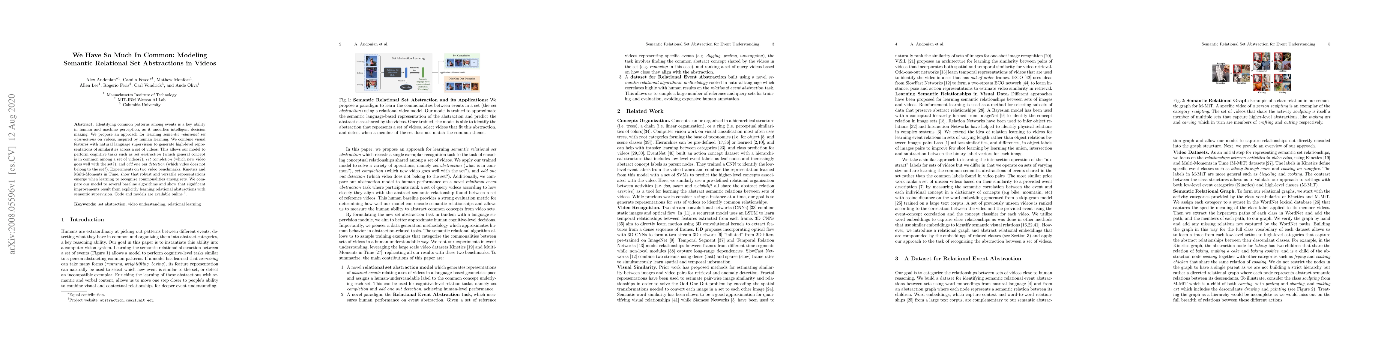Identifying common patterns among events is a key ability in human and machine perception, as it underlies intelligent decision making. We propose an approach for learning semantic relational set abstractions on videos, inspired by human learning. We combine visual features with natural language supervision to generate high-level representations of similarities across a set of videos. This allows our model to perform cognitive tasks such as set abstraction (which general concept is in common among a set of videos?), set completion (which new video goes well with the set?), and odd one out detection (which video does not belong to the set?). Experiments on two video benchmarks, Kinetics and Multi-Moments in Time, show that robust and versatile representations emerge when learning to recognize commonalities among sets. We compare our model to several baseline algorithms and show that significant improvements result from explicitly learning relational abstractions with semantic supervision.
