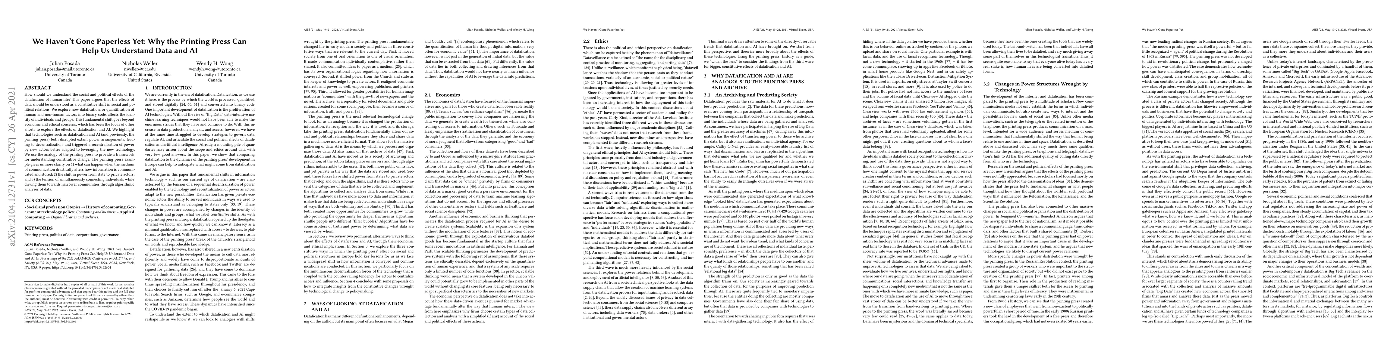 The paper proposes a novel framework for understanding constitutive change by drawing parallels between datafication, AI, and the historical impact of the printing press.