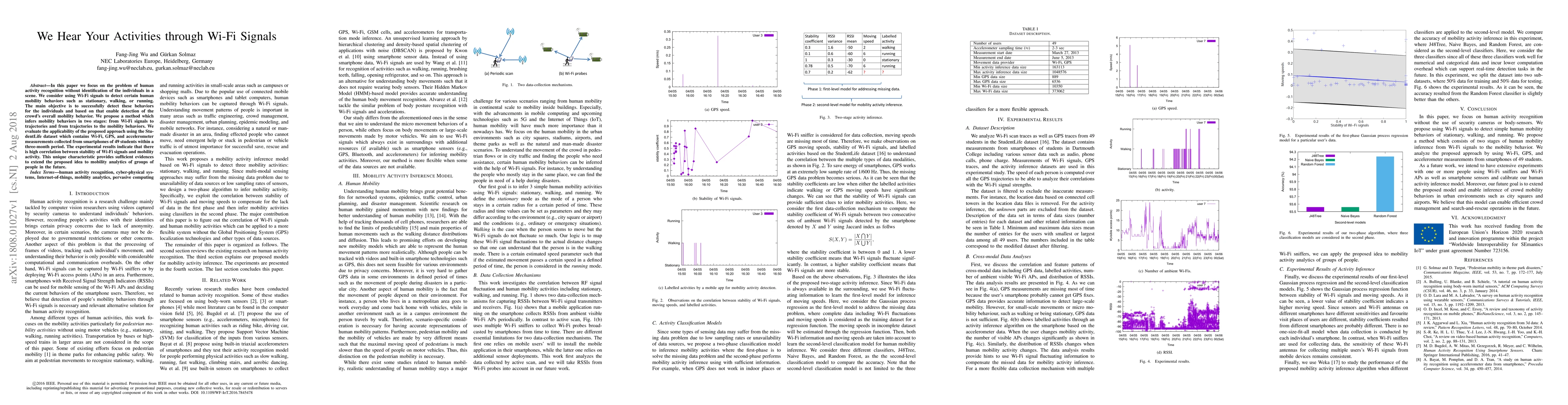 This paper presents a method for recognizing human mobility behaviors (e.g., stationary, walking, running) using Wi-Fi signals without identifying individuals. The approach involves inferring behaviors in two stages from Wi-Fi signals to trajectories, and trajectories to mobility behaviors, showing high correlation between Wi-Fi stability and activity.