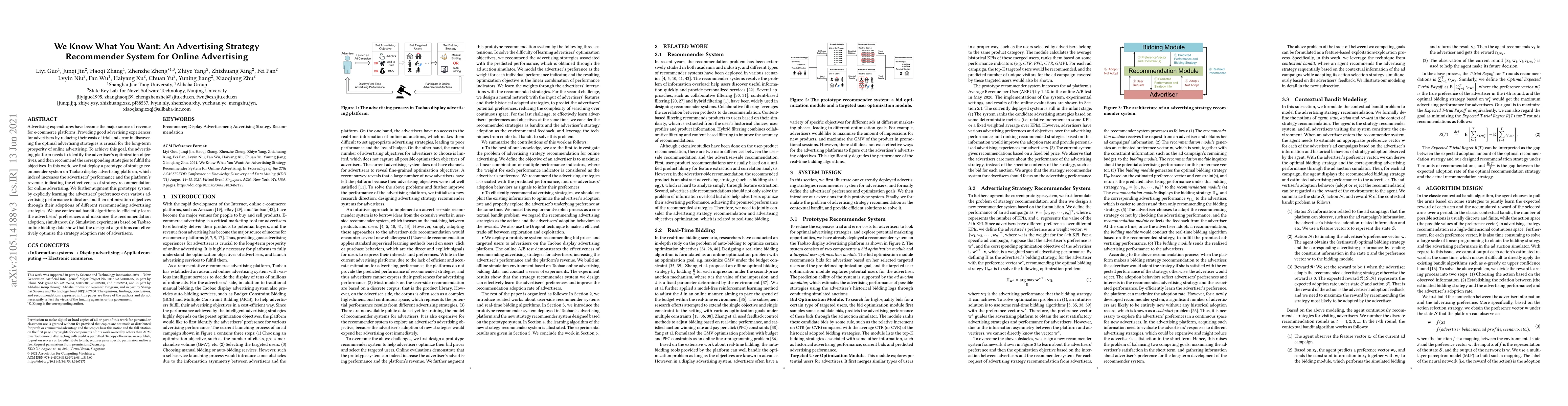This research develops an advertising strategy recommender system to enhance online advertising effectiveness by reducing advertisers' trial and error. The system successfully increases advertiser performance and platform revenue on Taobao, demonstrating the effectiveness of strategy recommendations and optimizing strategy adoption through contextual bandit algorithms.