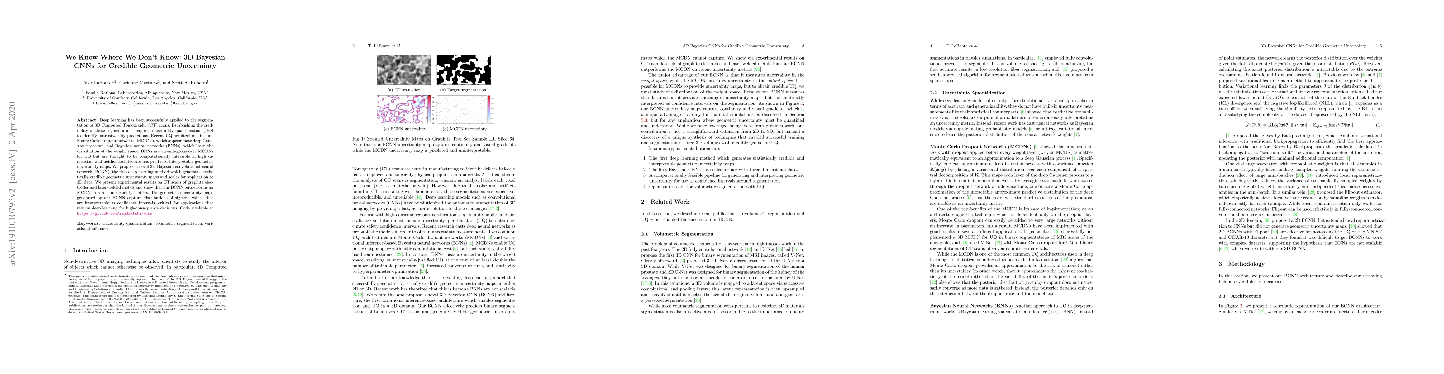 Deep learning has been successfully applied to the segmentation of 3D Computed Tomography (CT) scans. Establishing the credibility of these segmentations requires uncertainty quantification (UQ) to identify untrustworthy predictions. Recent UQ architectures include Monte Carlo dropout networks (MCDNs), which approximate deep Gaussian processes, and Bayesian neural networks (BNNs), which learn the distribution of the weight space. BNNs are advantageous over MCDNs for UQ but are thought to be computationally infeasible in high dimension, and neither architecture has produced interpretable geometric uncertainty maps. We propose a novel 3D Bayesian convolutional neural network (BCNN), the first deep learning method which generates statistically credible geometric uncertainty maps and scales for application to 3D data. We present experimental results on CT scans of graphite electrodes and laser-welded metals and show that our BCNN outperforms an MCDN in recent uncertainty metrics. The geometric uncertainty maps generated by our BCNN capture distributions of sigmoid values that are interpretable as confidence intervals, critical for applications that rely on deep learning for high-consequence decisions. Code available at https://github.com/sandialabs/bcnn.