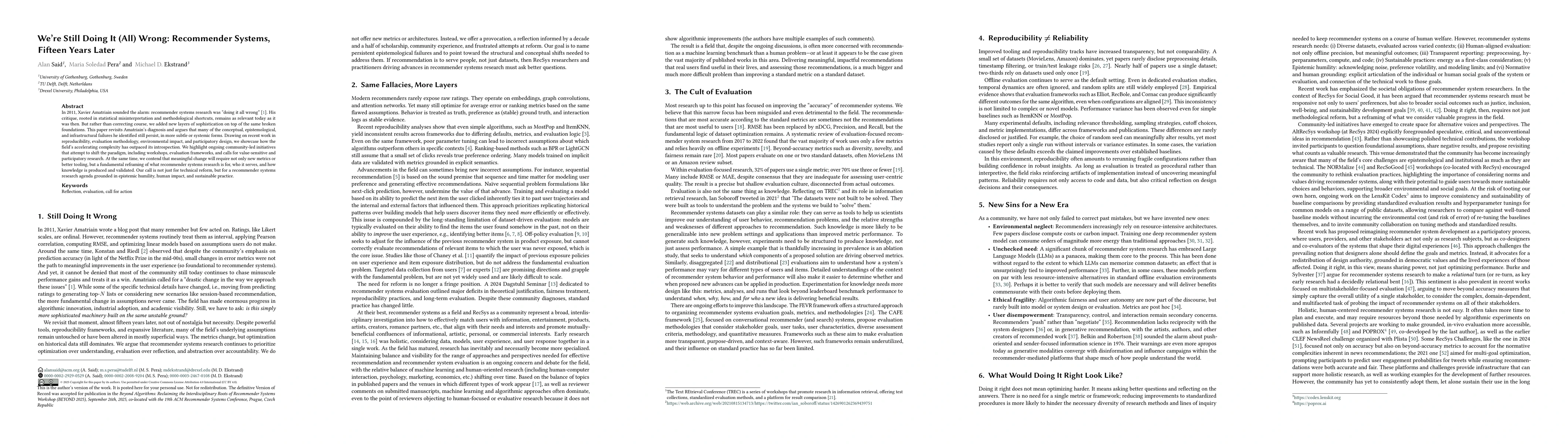 In 2011, Xavier Amatriain sounded the alarm: recommender systems research was "doing it all wrong" [1]. His critique, rooted in statistical misinterpretation and methodological shortcuts, remains as relevant today as it was then. But rather than correcting course, we added new layers of sophistication on top of the same broken foundations. This paper revisits Amatriain's diagnosis and argues that many of the conceptual, epistemological, and infrastructural failures he identified still persist, in more subtle or systemic forms. Drawing on recent work in reproducibility, evaluation methodology, environmental impact, and participatory design, we showcase how the field's accelerating complexity has outpaced its introspection. We highlight ongoing community-led initiatives that attempt to shift the paradigm, including workshops, evaluation frameworks, and calls for value-sensitive and participatory research. At the same time, we contend that meaningful change will require not only new metrics or better tooling, but a fundamental reframing of what recommender systems research is for, who it serves, and how knowledge is produced and validated. Our call is not just for technical reform, but for a recommender systems research agenda grounded in epistemic humility, human impact, and sustainable practice.