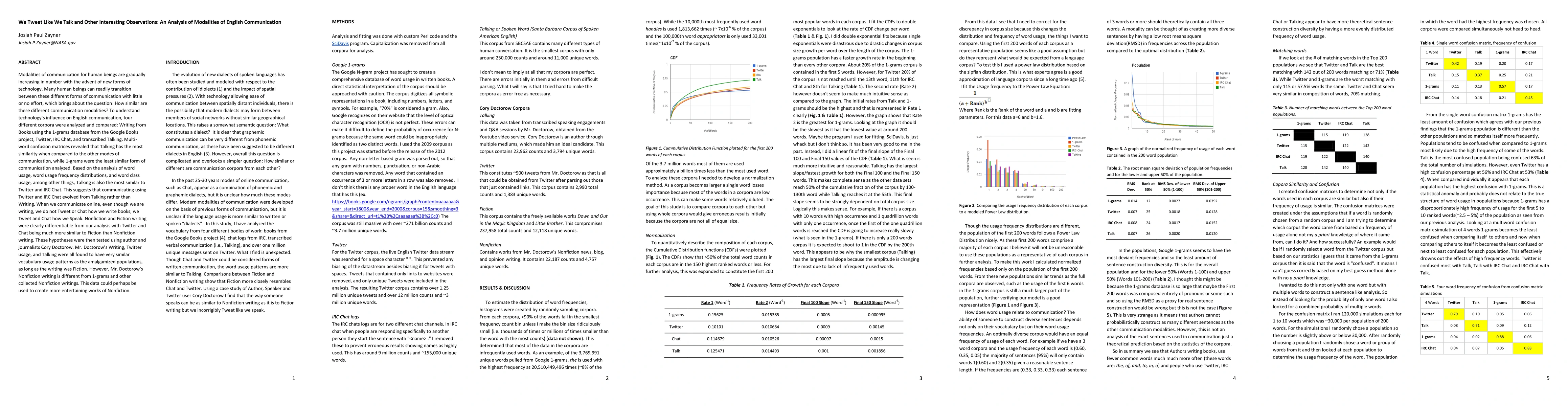 Modalities of communication for human beings are gradually increasing in number with the advent of new forms of technology. Many human beings can readily transition between these different forms of communication with little or no effort, which brings about the question: How similar are these different communication modalities? To understand technology$\text{'}$s influence on English communication, four different corpora were analyzed and compared: Writing from Books using the 1-grams database from the Google Books project, Twitter, IRC Chat, and transcribed Talking. Multi-word confusion matrices revealed that Talking has the most similarity when compared to the other modes of communication, while 1-grams were the least similar form of communication analyzed. Based on the analysis of word usage, word usage frequency distributions, and word class usage, among other things, Talking is also the most similar to Twitter and IRC Chat. This suggests that communicating using Twitter and IRC Chat evolved from Talking rather than Writing. When we communicate online, even though we are writing, we do not Tweet or Chat how we write books; we Tweet and Chat how we Speak. Nonfiction and Fiction writing were clearly differentiable from our analysis with Twitter and Chat being much more similar to Fiction than Nonfiction writing. These hypotheses were then tested using author and journalists Cory Doctorow. Mr. Doctorow$\text{'}$s Writing, Twitter usage, and Talking were all found to have very similar vocabulary usage patterns as the amalgamized populations, as long as the writing was Fiction. However, Mr. Doctorow$\text{'}$s Nonfiction writing is different from 1-grams and other collected Nonfiction writings. This data could perhaps be used to create more entertaining works of Nonfiction.