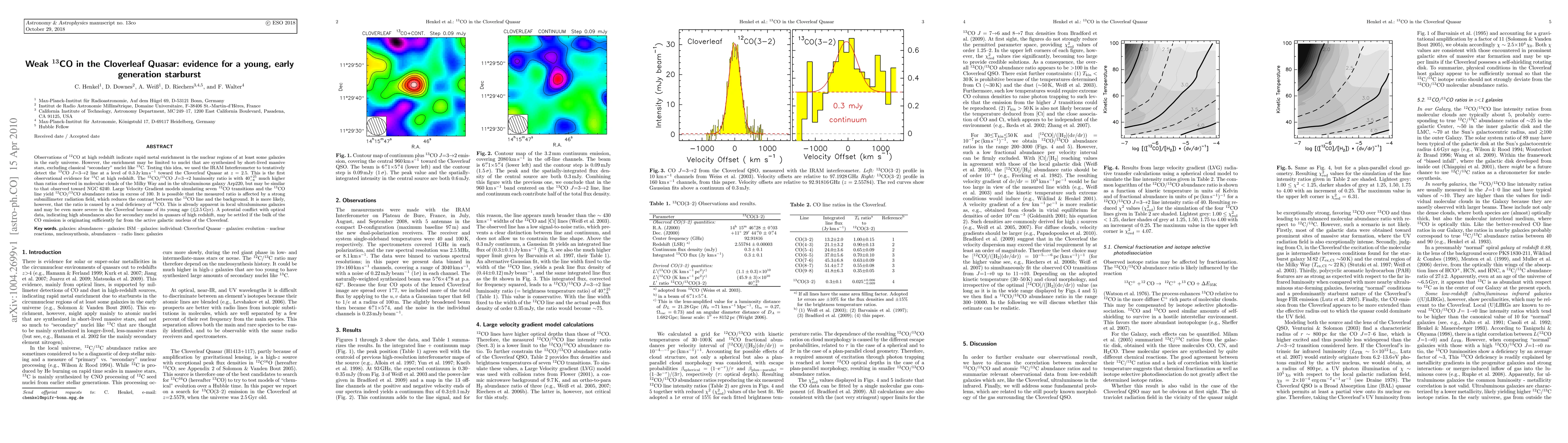Observations of 12CO at high redshift indicate rapid metal enrichment in the nuclear regions of at least some galaxies in the early universe. However, the enrichment may be limited to nuclei that are synthesized by short-lived massive stars, excluding classical secondary nuclei like 13CO. Testing this idea, we tentatively detect the 13CO J=3-2 line at a level of 0.3 Jy km/s toward the Cloverleaf Quasar at redshift 2.5. This is the first observational evidence for 13CO at high redshift. The 12CO/13CO J=3-2 luminosity ratio is with at least 40 much higher than ratios observed in molecular clouds of the Milky Way and in the ultraluminous galaxy Arp 220, but may be similar to that observed toward NGC 6240. Large Velocity Gradient (LVG) models simulating seven 12CO transitions and the 13CO line yield 12CO/13CO abundance ratios in excess of 100 for the Cloverleaf. It is possible that the measured ratio is affected by a strong submillimeter radiation field, which reduces the contrast between the 13CO line and the background. It is more likely, however, that the ratio is caused by a real deficiency of 13CO. A potential conflict with optical data, indicating high abundances also for secondary nuclei in quasars of high redshift, may be settled if the bulk of the CO emission is originating sufficiently far from the active galactic nucleus.