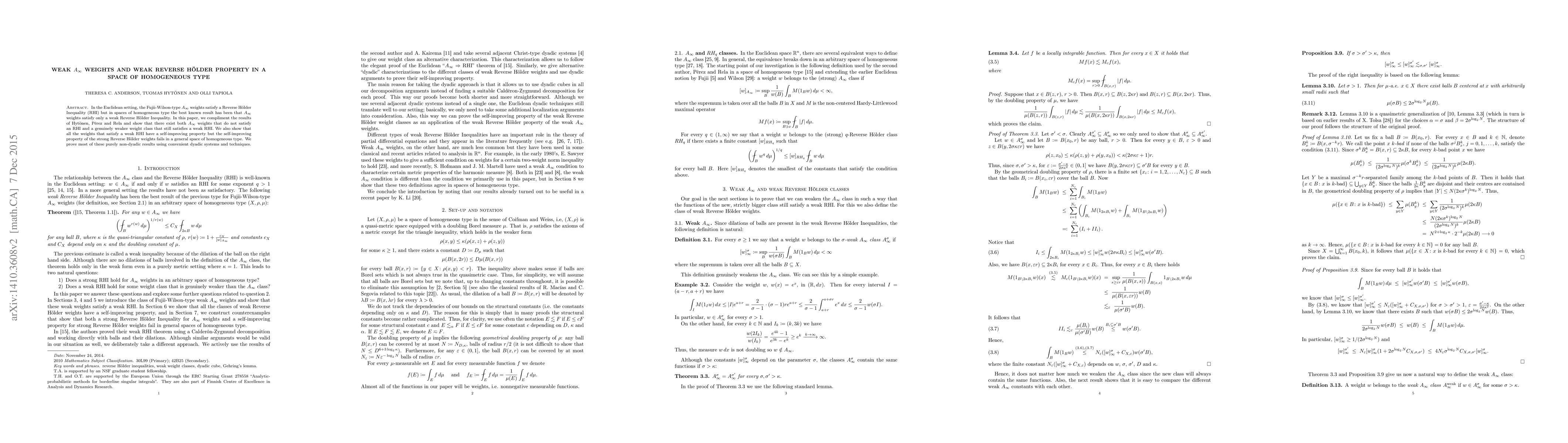 Researchers show that A_¿inf weights in spaces of homogeneous type can satisfy a weak Reverse H"older Inequality, but some weights do not meet the stronger condition, providing insight into optimal weight classes for harmonic analysis.