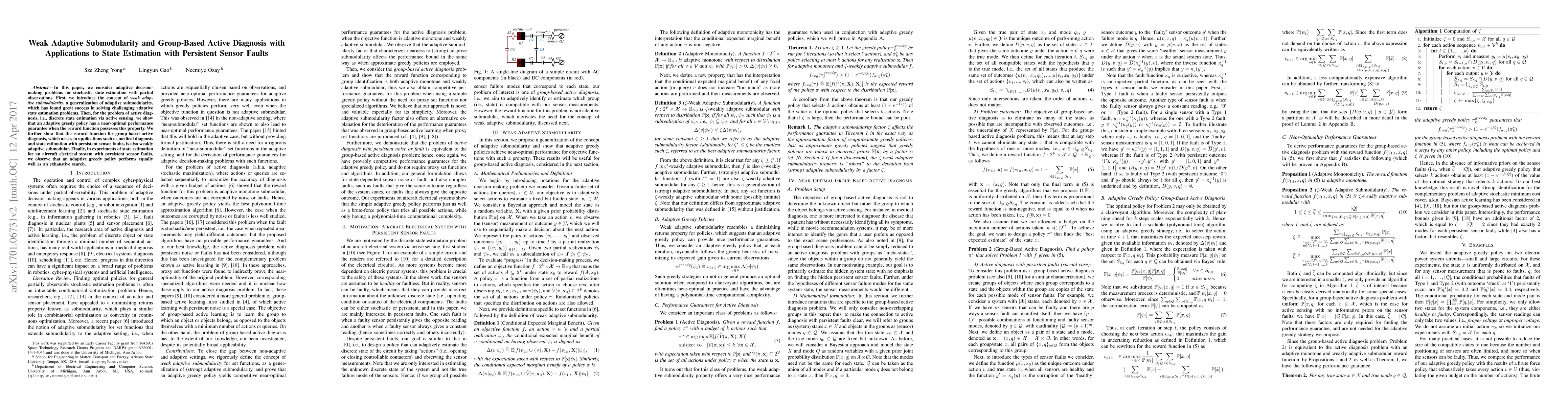 This paper introduces weak adaptive submodularity to enhance adaptive decision-making in stochastic state estimation with partial observations. It demonstrates that an adaptive greedy policy achieves near-optimal performance for active diagnosis, particularly in group-based scenarios, and validates its effectiveness through experiments on aircraft electrical systems with persistent sensor faults.