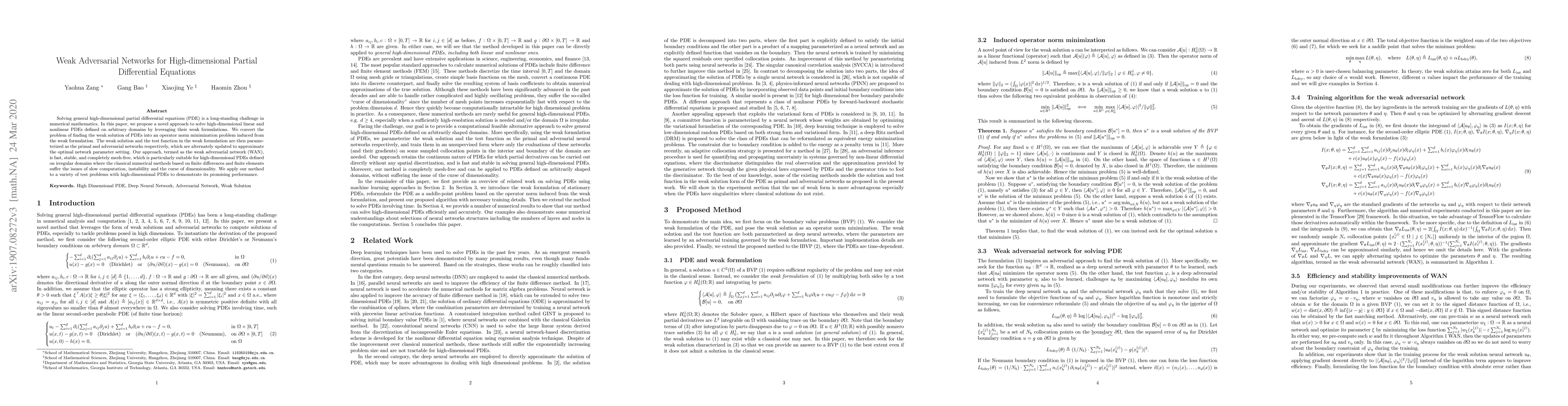 Solving general high-dimensional partial differential equations (PDE) is a long-standing challenge in numerical mathematics. In this paper, we propose a novel approach to solve high-dimensional linear and nonlinear PDEs defined on arbitrary domains by leveraging their weak formulations. We convert the problem of finding the weak solution of PDEs into an operator norm minimization problem induced from the weak formulation. The weak solution and the test function in the weak formulation are then parameterized as the primal and adversarial networks respectively, which are alternately updated to approximate the optimal network parameter setting. Our approach, termed as the weak adversarial network (WAN), is fast, stable, and completely mesh-free, which is particularly suitable for high-dimensional PDEs defined on irregular domains where the classical numerical methods based on finite differences and finite elements suffer the issues of slow computation, instability and the curse of dimensionality. We apply our method to a variety of test problems with high-dimensional PDEs to demonstrate its promising performance.