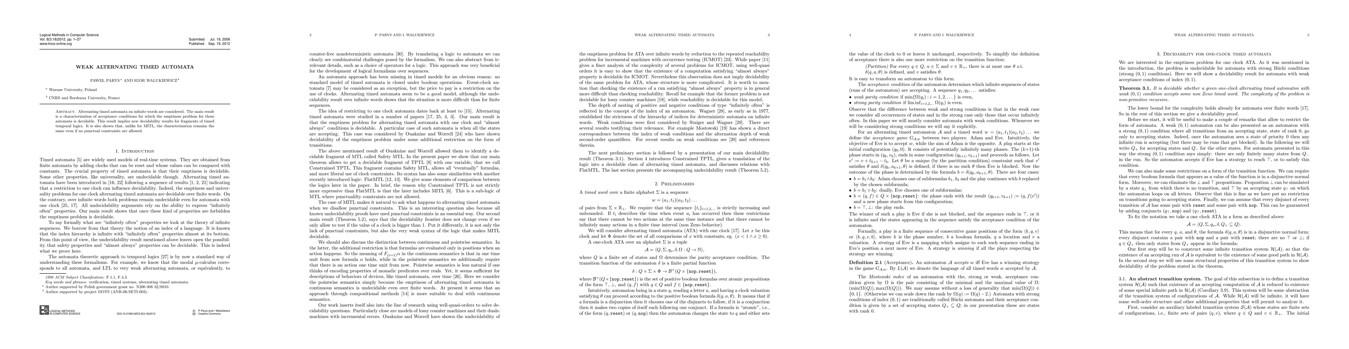 This paper characterizes acceptance conditions for alternating timed automata on infinite words, proving decidability of the emptiness problem under certain conditions. This leads to new decidability results for fragments of timed temporal logics, and importantly, the characterization holds even without punctual constraints.