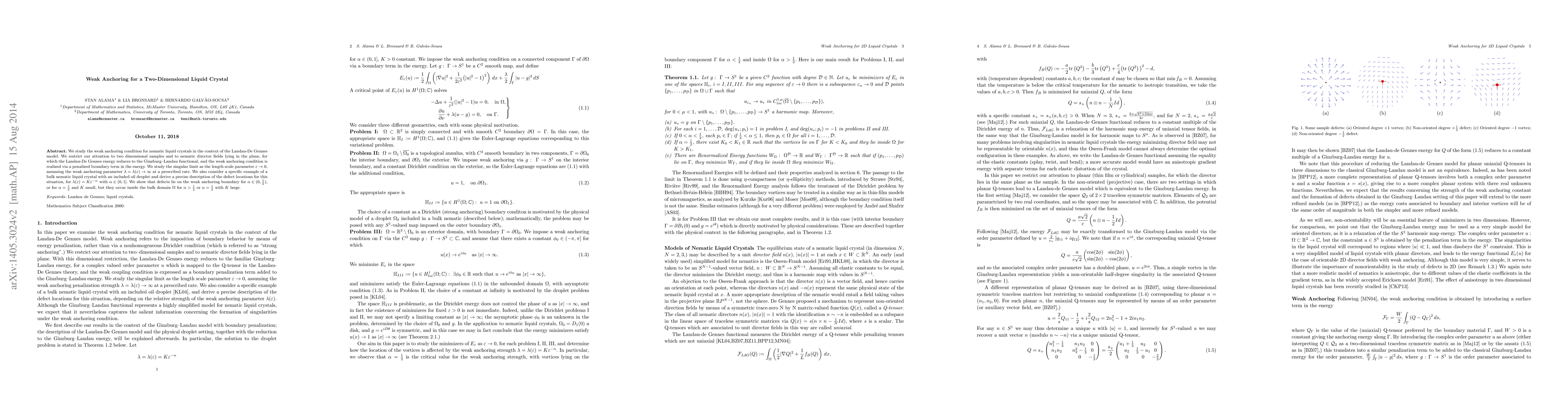 We study the weak anchoring condition for nematic liquid crystals in the context of the Landau-De Gennes model. We restrict our attention to two dimensional samples and to nematic director fields lying in the plane, for which the Landau-De Gennes energy reduces to the Ginzburg--Landau functional, and the weak anchoring condition is realized via a penalized boundary term in the energy. We study the singular limit as the length scale parameter $\varepsilon\to 0$, assuming the weak anchoring parameter $\lambda=\lambda(\varepsilon)\to\infty$ at a prescribed rate. We also consider a specific example of a bulk nematic liquid crystal with an included oil droplet and derive a precise description of the defect locations for this situation, for $\lambda(\varepsilon)=K\varepsilon^{-\alpha}$ with $\alpha\in (0,1]$. We show that defects lie on the weak anchoring boundary for $\alpha\in (0,\frac12)$, or for $\alpha=\frac12$ and $K$ small, but they occur inside the bulk domain $\Omega$ for $\alpha>\frac12$ or $\alpha=\frac12$ with $K$ large.