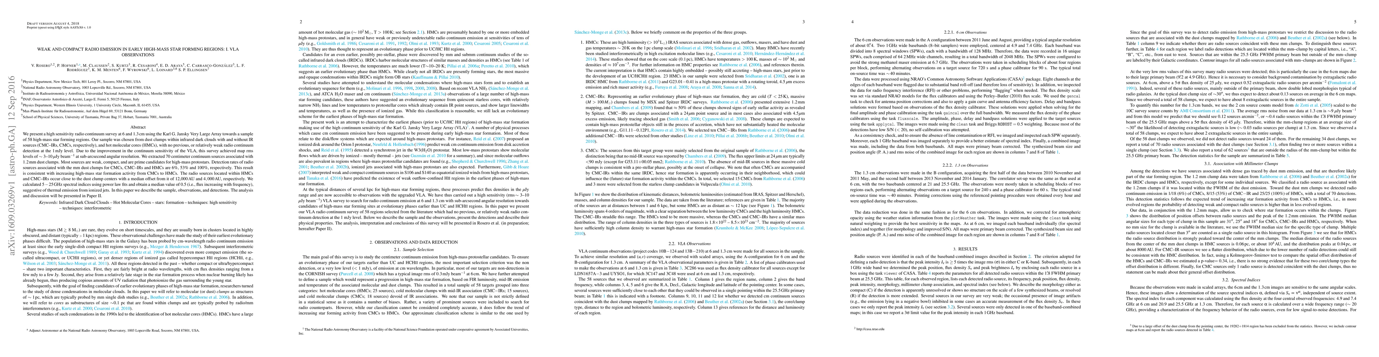 This research presents a sensitive radio continuum survey at 6 and 1.3 cm using the VLA towards 58 high-mass star forming regions. With map rms levels of ~3-10 $mu$Jy beam$^{-1}$, they detected 70 cm sources associated with 1.2 mm dust clumps. Detection rates are 6%, 53%, and 100% for CMCs, CMC-IRs, and HMCs respectively, indicating increasing star formation activity. Radio sources near HMCs and CMC-IRs are close to dust clump centers, with median offsets of 12,000 and 4,000 AU. Spectral indices suggest thermal emission from ionized jets. This paper details the sample, observations, and detections; analysis and discussion follow in Paper II.