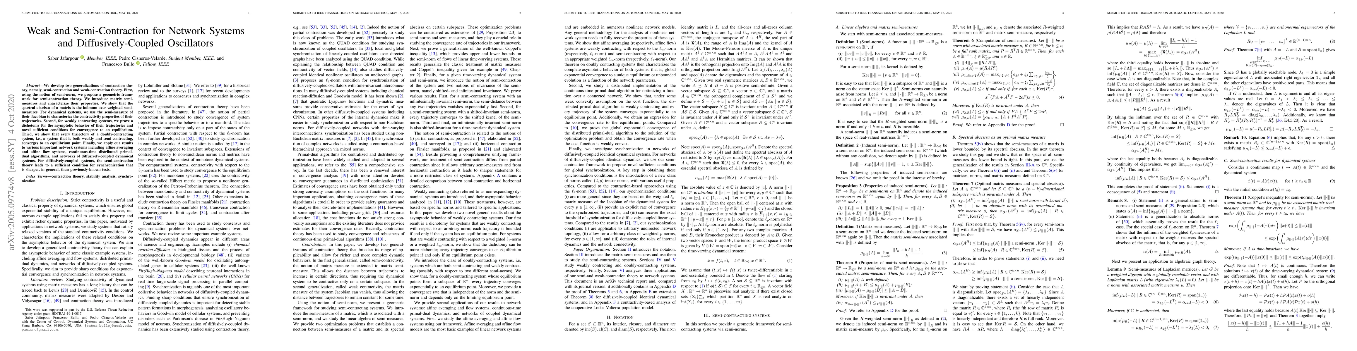This paper develops semi-contraction and weak-contraction theories for network systems and diffusively-coupled oscillators, introducing matrix semi-measures and proving convergence conditions for doubly-contracting systems. It also provides a sharper condition for synchronization in diffusively-coupled systems compared to existing methods.