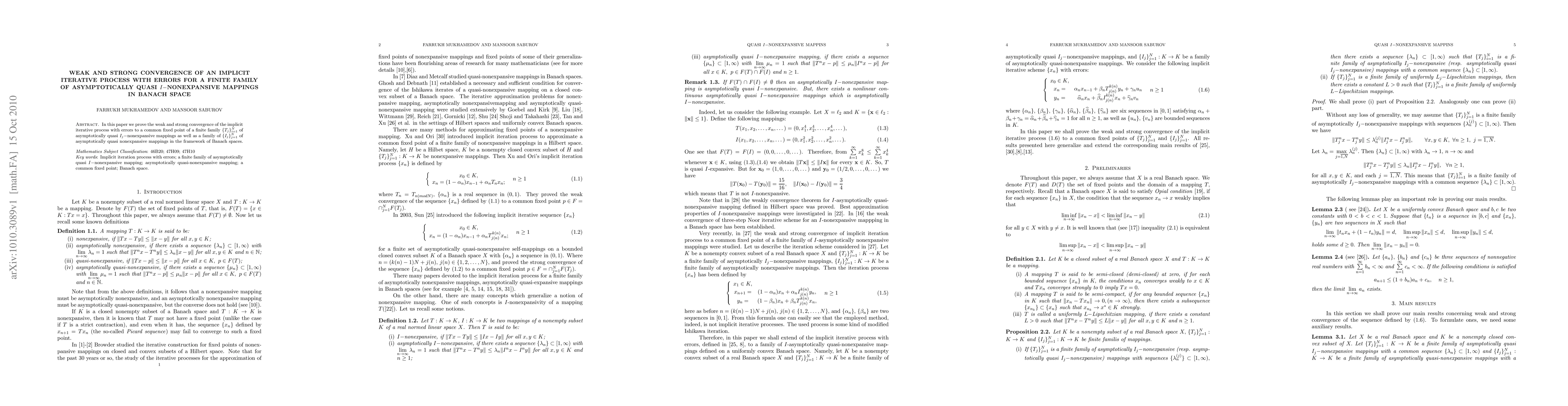 In this paper we prove the weak and strong convergence of the implicit iterative process with errors to a common fixed point of a finite family $\{T_j\}_{i=1}^N$ of asymptotically quasi $I_j-$nonexpansive mappings as well as a family of $\{I_j\}_{j=1}^N$ of asymptotically quasi nonexpansive mappings in the framework of Banach spaces.