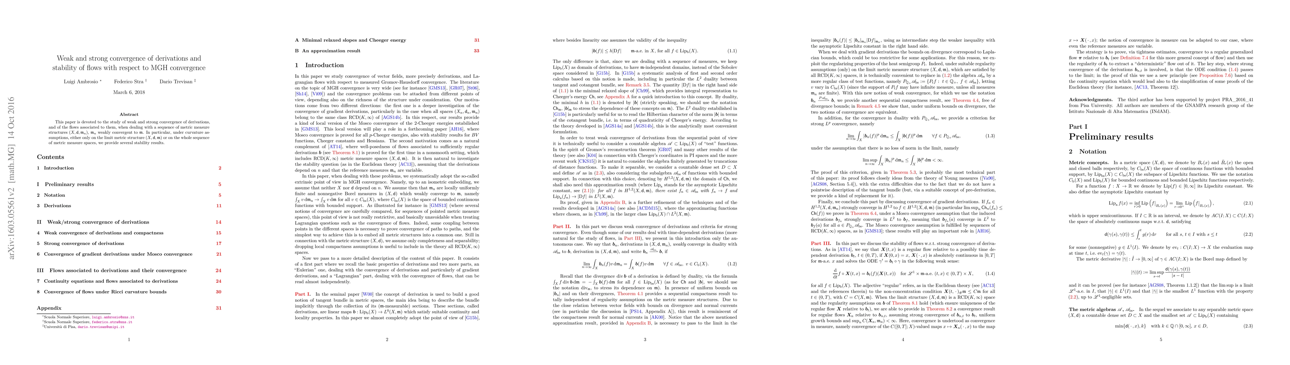 This paper is devoted to the study of weak and strong convergence of derivations, and of the flows associated to them, when dealing with a sequence of metric measure structures (X,d,m_n), m_n weakly convergent to m. In particular, under curvature assumptions, either only on the limit metric structure (X,d,m) or on the whole sequence of metric measure spaces, we provide several stability results.