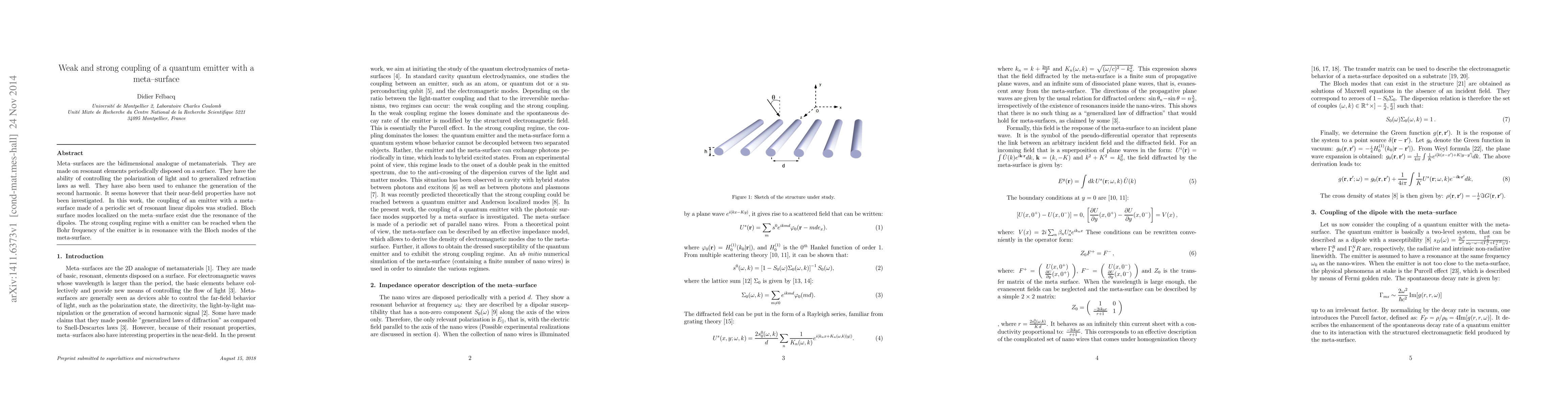 This paper investigates the coupling between a quantum emitter and a meta-surface composed of resonant dipoles, exploring both weak and strong coupling regimes. Strong coupling occurs when the emitter's Bohr frequency matches the meta-surface's Bloch surface modes, enhancing near-field interactions.