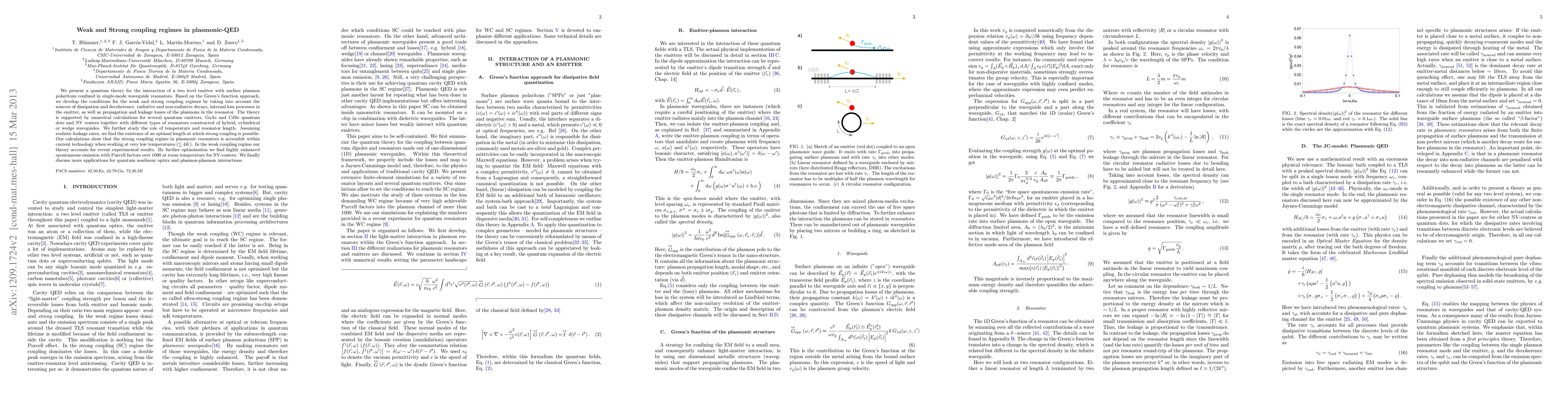 This paper develops a quantum theory for the interaction between two-level emitters and plasmon polaritons in waveguide resonators, identifying conditions for weak and strong coupling regimes while considering various loss mechanisms. The study finds that strong coupling is feasible with current technology at low temperatures, and weak coupling aligns with recent experimental results.
