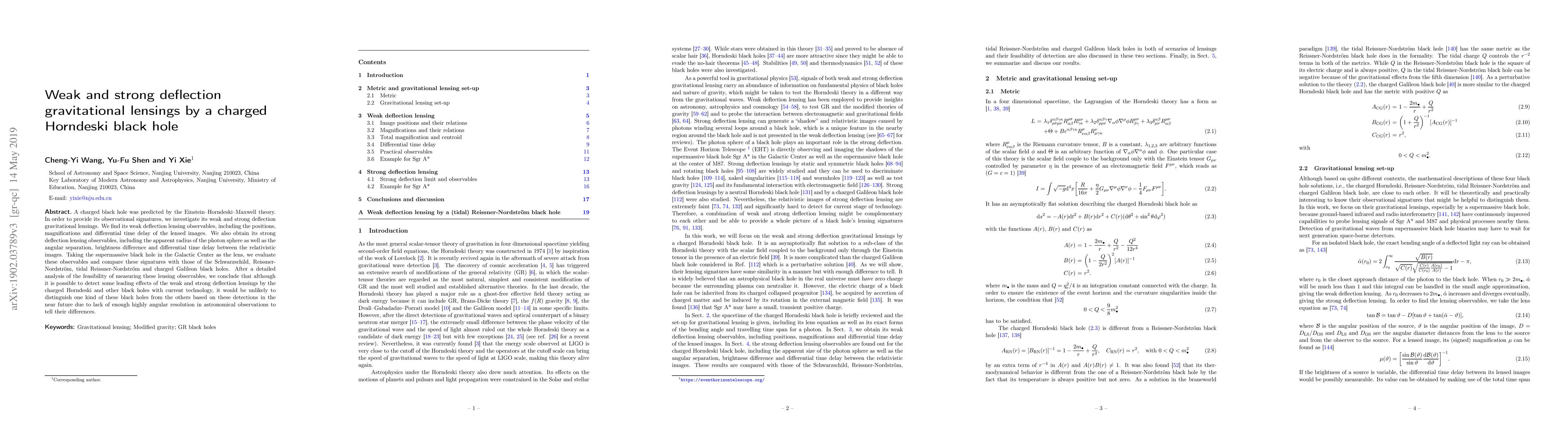 A charged black hole was predicted by the Einstein--Horndeski--Maxwell theory. In order to provide its observational signatures, we investigate its weak and strong deflection gravitational lensings. We find its weak deflection lensing observables, including the positions, magnifications and differential time delay of the lensed images. We also obtain its strong deflection lensing observables, including the apparent radius of the photon sphere as well as the angular separation, brightness difference and differential time delay between the relativistic images. Taking the supermassive black hole in the Galactic Center as the lens, we evaluate these observables and compare these signatures with those of the Schwarzschild, Reissner-Nordstr\"{o}m, tidal Reissner-Nordstr\"{o}m and charged Galileon black holes. After a detailed analysis of the feasibility of measuring these lensing observables, we conclude that although it is possible to detect some leading effects of the weak and strong deflection lensings by the charged Horndeski and other black holes with current technology, it would be unlikely to distinguish one kind of these black holes from the others based on these detections in the near future due to lack of enough highly angular resolution in astronomical observations to tell their differences.