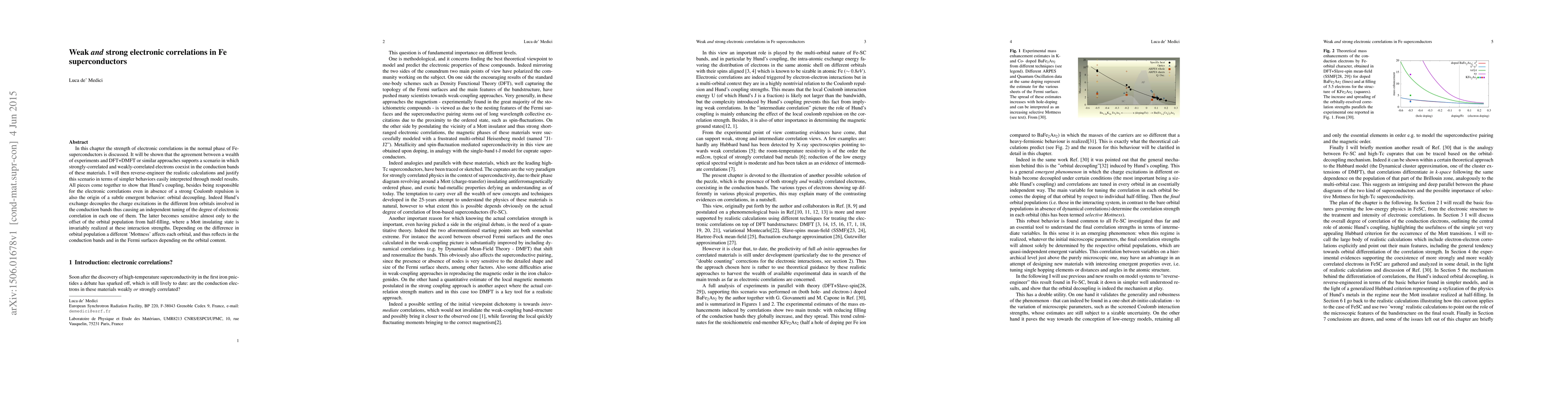 In this chapter the strength of electronic correlations in the normal phase of Fe-superconductors is discussed. It will be shown that the agreement between a wealth of experiments and DFT+DMFT or similar approaches supports a scenario in which strongly-correlated and weakly-correlated electrons coexist in the conduction bands of these materials. I will then reverse-engineer the realistic calculations and justify this scenario in terms of simpler behaviors easily interpreted through model results. All pieces come together to show that Hund's coupling, besides being responsible for the electronic correlations even in absence of a strong Coulomb repulsion is also the origin of a subtle emergent behavior: orbital decoupling. Indeed Hund's exchange decouples the charge excitations in the different Iron orbitals involved in the conduction bands thus causing an independent tuning of the degree of electronic correlation in each one of them. The latter becomes sensitive almost only to the offset of the orbital population from half-filling, where a Mott insulating state is invariably realized at these interaction strengths. Depending on the difference in orbital population a different 'Mottness' affects each orbital, and thus reflects in the conduction bands and in the Fermi surfaces depending on the orbital content.