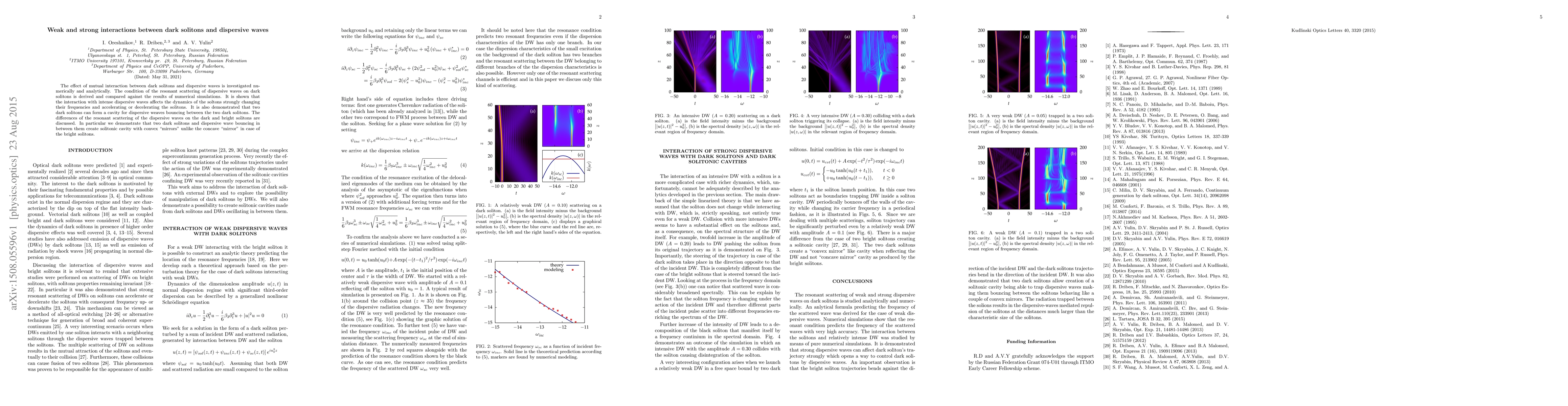 This paper investigates the interactions between dark solitons and dispersive waves, revealing that intense dispersive waves significantly alter soliton dynamics, and shows that two dark solitons can create a cavity for dispersive waves, with the interaction forming a cavity with convex "mirrors" unlike the concave "mirror" seen with bright solitons.