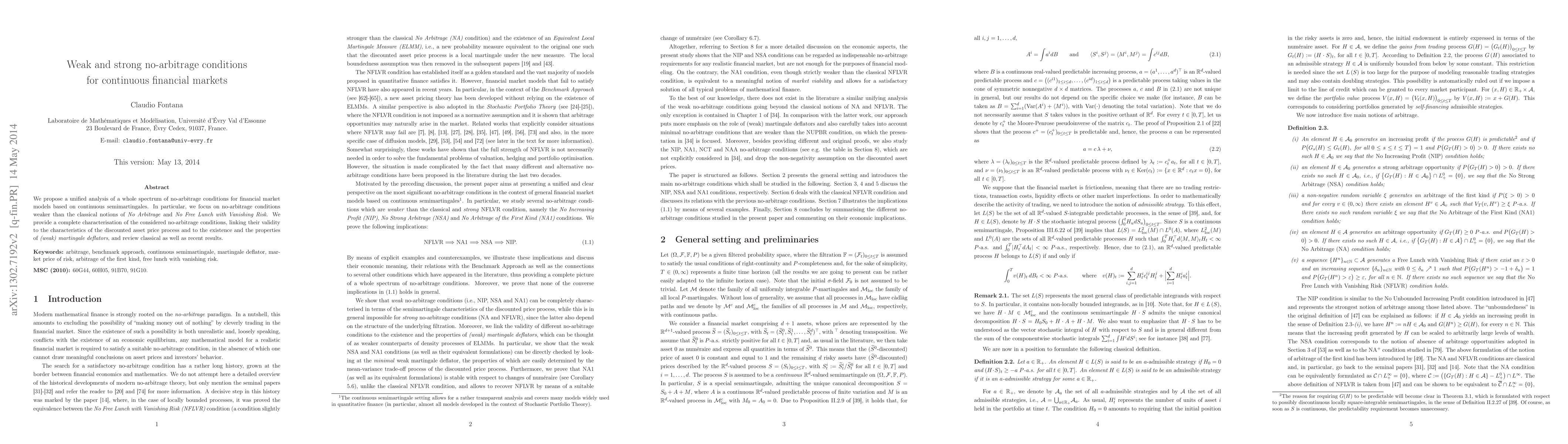 This paper offers a comprehensive analysis of various no-arbitrage conditions for continuous financial market models, distinguishing between weak and strong forms, and links their validity to the properties of asset price processes and the existence of martingale deflators. It also reviews both classical and recent findings in the field.