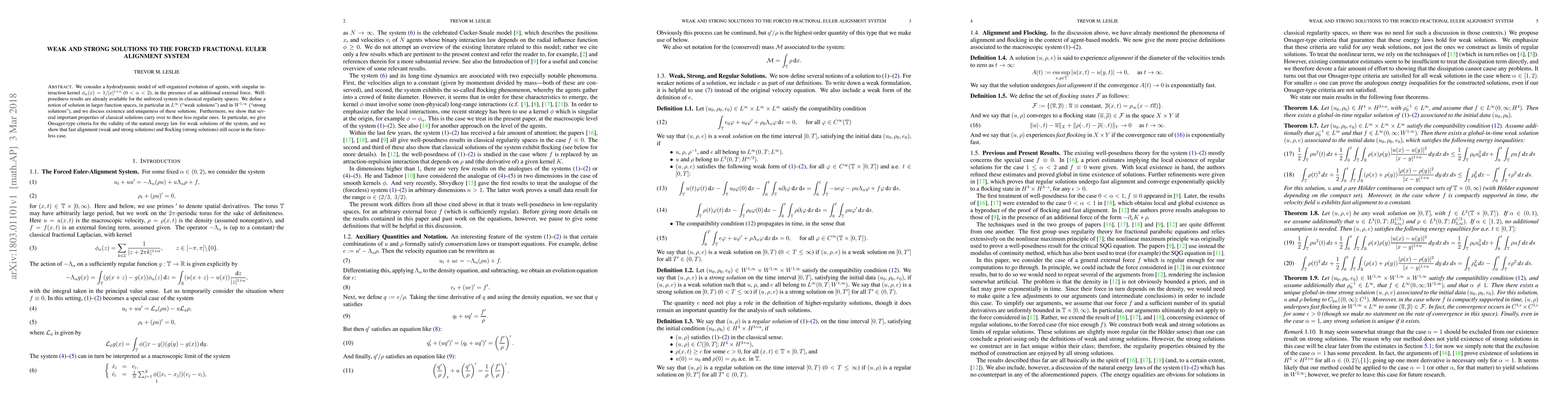 This research defines weak and strong solutions for a hydrodynamic model of agent evolution with singular interaction kernel, in the presence of external force. It establishes existence, uniqueness, and key properties of these less regular solutions, including Onsager-type criteria for energy law and persistence of fast alignment and flocking behaviors.
