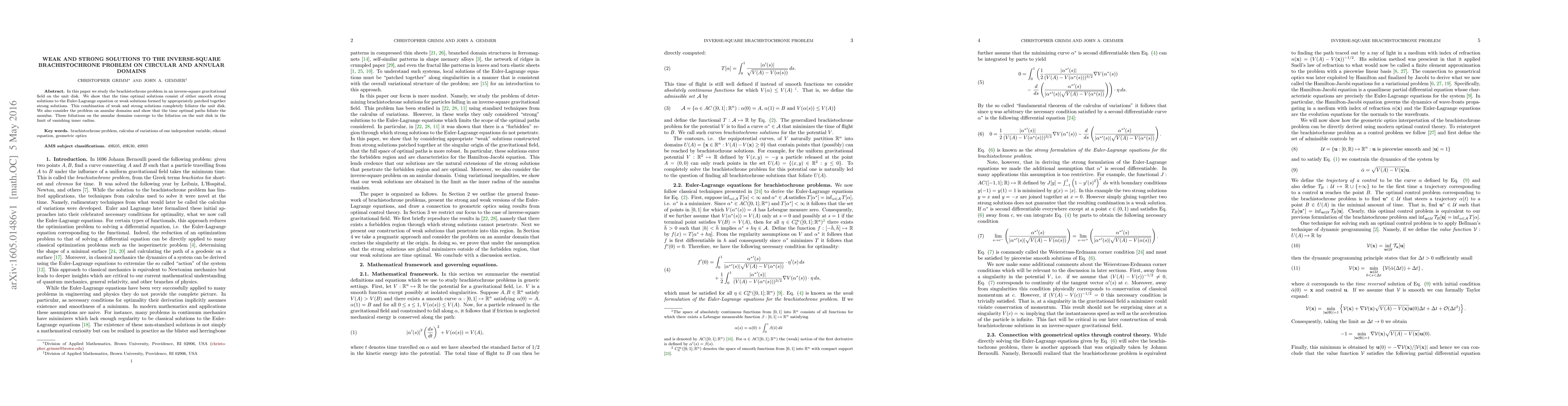This paper studies optimal paths in inverse-square gravitational fields on circular and annular domains, finding that time-optimal solutions consist of patched together strong or weak solutions that completely foliate the area.