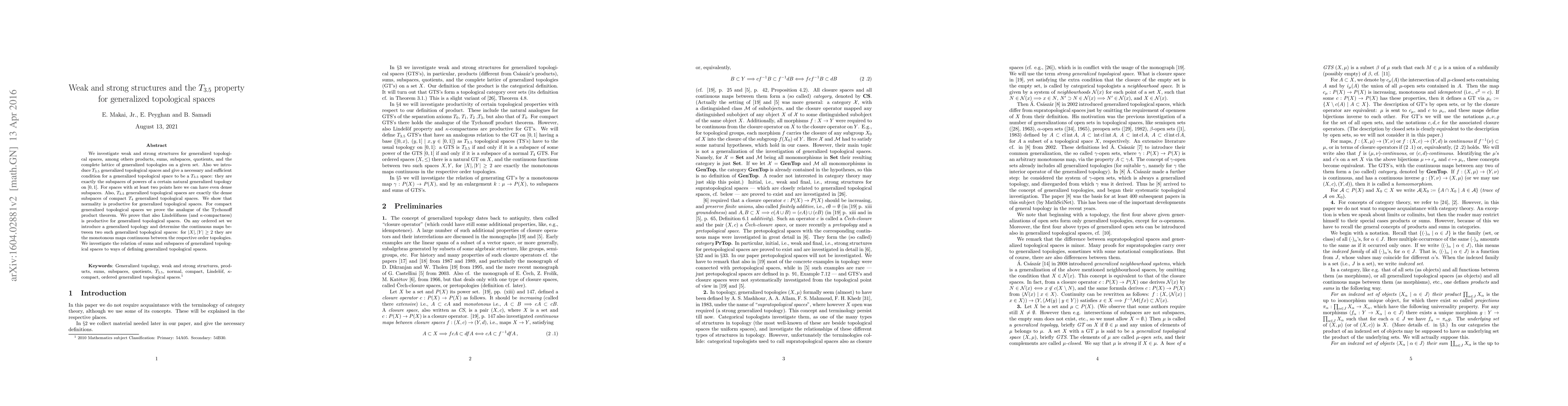 We investigate weak and strong structures for generalized topological spaces, among others products, sums, subspaces, quotients, and the complete lattice of generalized topologies on a given set. Also we introduce $T_{3.5}$ generalized topological spaces and give a necessary and sufficient condition for a generalized topological space to be a $T_{3.5}$ space: they are exactly the subspaces of powers of a certain natural generalized topology on $[0,1]$. For spaces with at least two points here we can have even dense subspaces. Also, $T_{3.5}$ generalized topological spaces are exactly the dense subspaces of compact $T_4$ generalized topological spaces. We show that normality is productive for generalized topological spaces. For compact generalized topological spaces we prove the analogue of the Tychonoff product theorem. We prove that also Lindel\"ofness (and $\kappa $-compactness) is productive for generalized topological spaces. On any ordered set we introduce a generalized topology and determine the continuous maps between two such generalized topological spaces: for $|X|, |Y| \ge 2$ they are the monotonous maps continuous between the respective order topologies. We investigate the relation of sums and subspaces of generalized topological spaces to ways of defining generalized topological spaces.