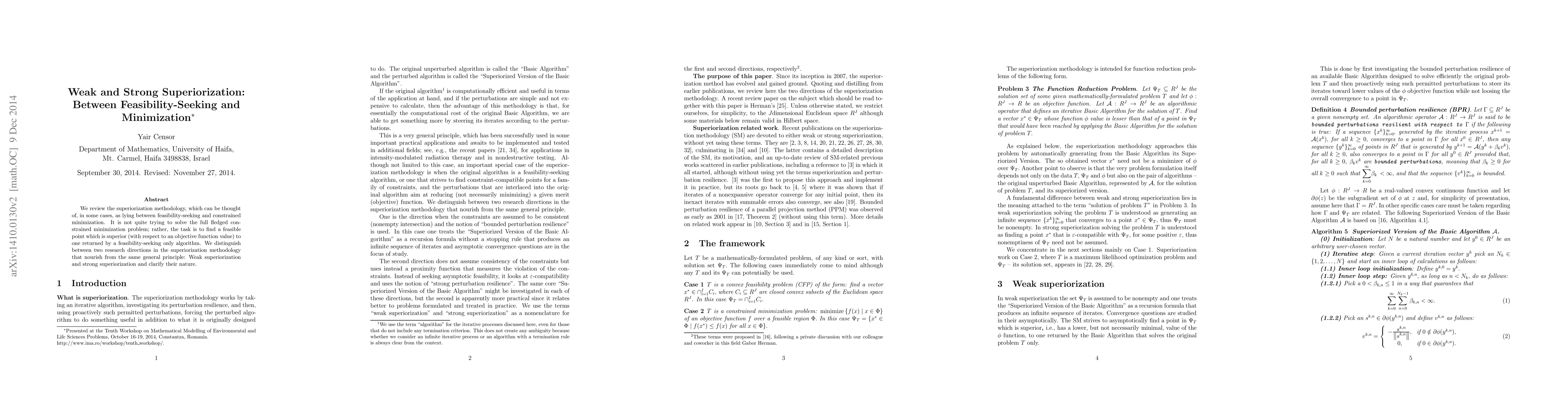 We review the superiorization methodology, which can be thought of, in some cases, as lying between feasibility-seeking and constrained minimization. It is not quite trying to solve the full fledged constrained minimization problem; rather, the task is to find a feasible point which is superior (with respect to an objective function value) to one returned by a feasibility-seeking only algorithm. We distinguish between two research directions in the superiorization methodology that nourish from the same general principle: Weak superiorization and strong superiorization and clarify their nature.