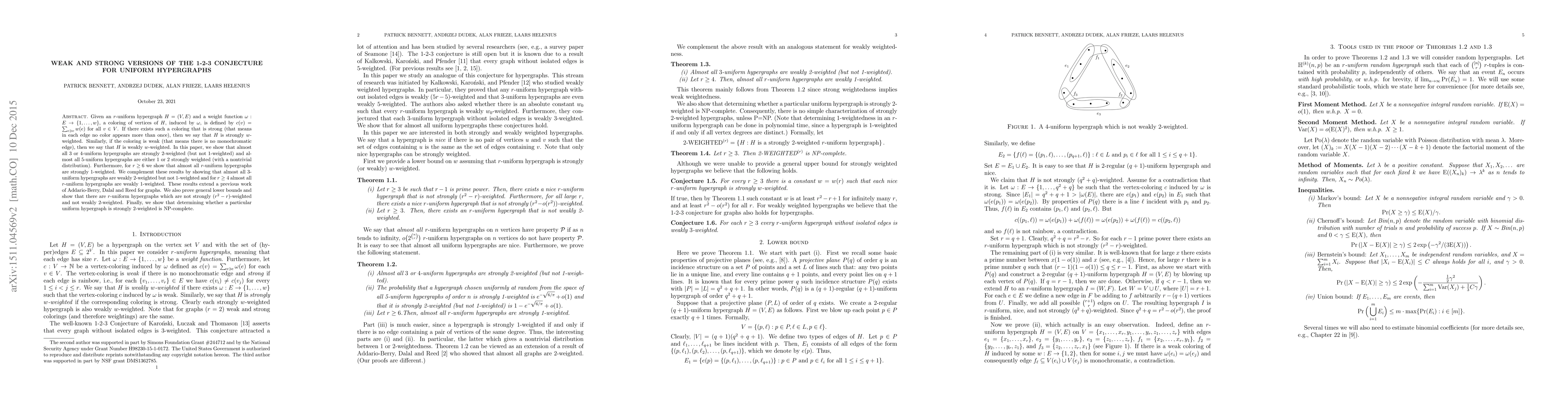 This paper investigates the 1-2-3 conjecture for uniform hypergraphs, proving that almost all 3 or 4-uniform hypergraphs are strongly 2-weighted but not 1-weighted, and almost all 5-uniform hypergraphs are either 1 or 2 strongly weighted. It also shows that for $r\ge 6$, almost all $r$-uniform hypergraphs are strongly 1-weighted, and complements these findings with results on weak weightings.