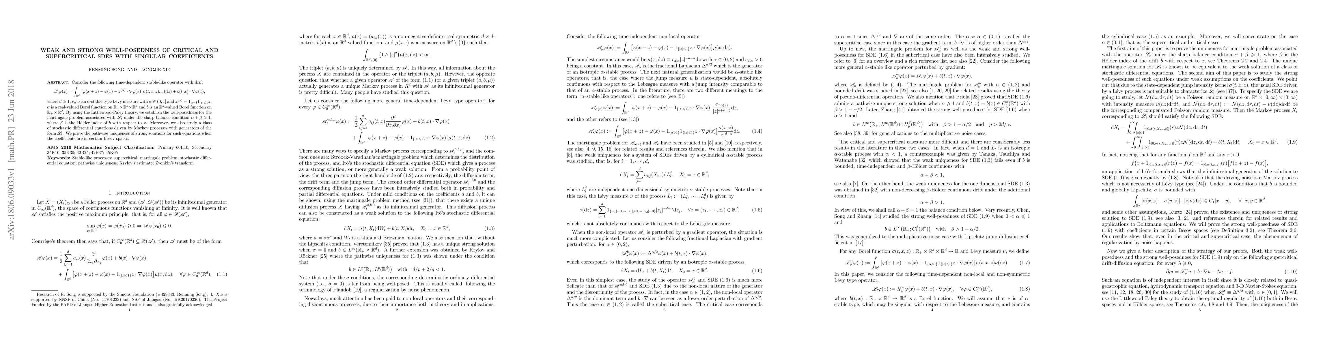 Researchers establish well-posedness for martingale problems of critical and supercritical stochastic differential equations with singular coefficients under certain conditions, including a sharp balance condition. They also prove pathwise uniqueness of strong solutions for such equations in specific function spaces.
