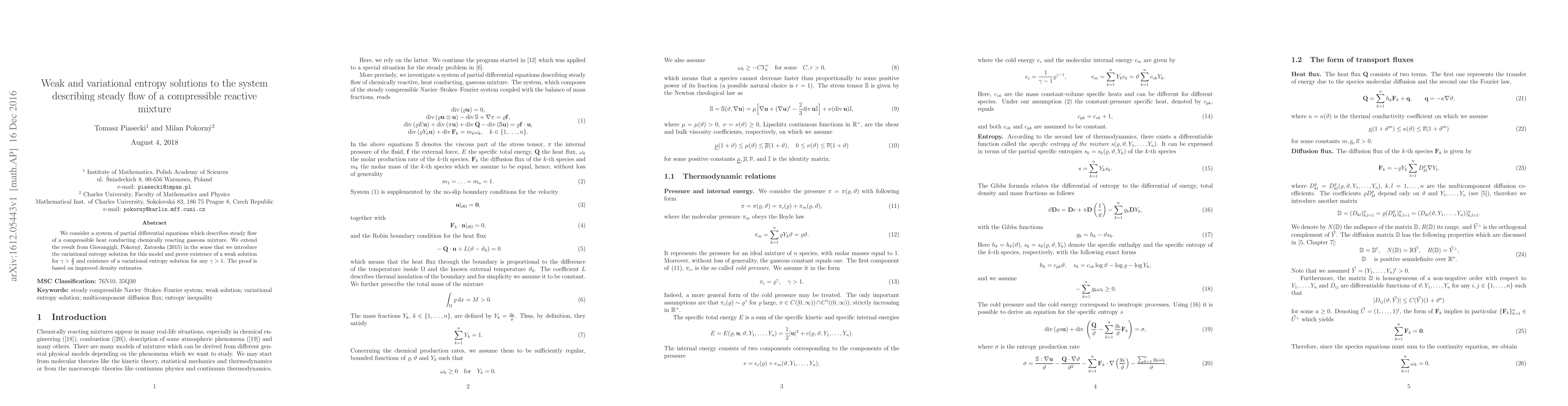 This paper extends a previous result on a system of partial differential equations describing steady flow of a compressible reactive gaseous mixture by introducing variational entropy solutions and proving the existence of weak solutions for $\gamma > \frac{4}{3}$ and variational entropy solutions for any $\gamma > 1$, utilizing improved density estimates.